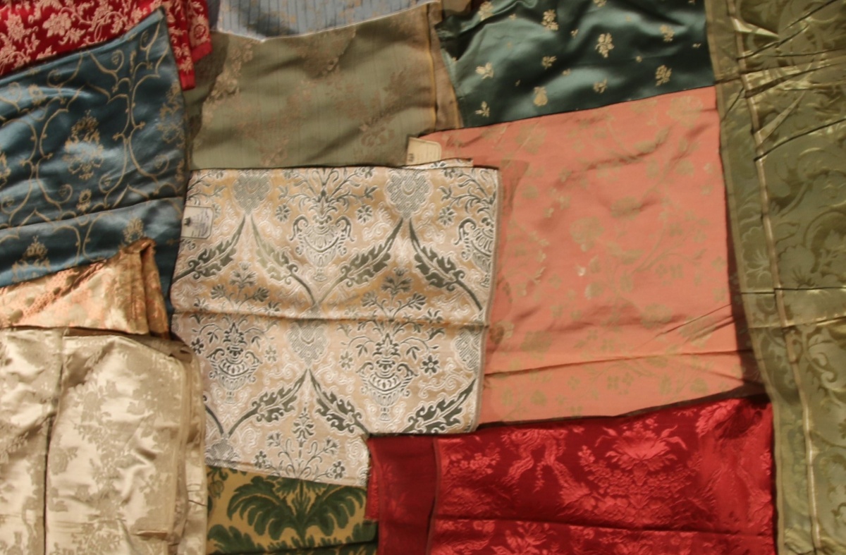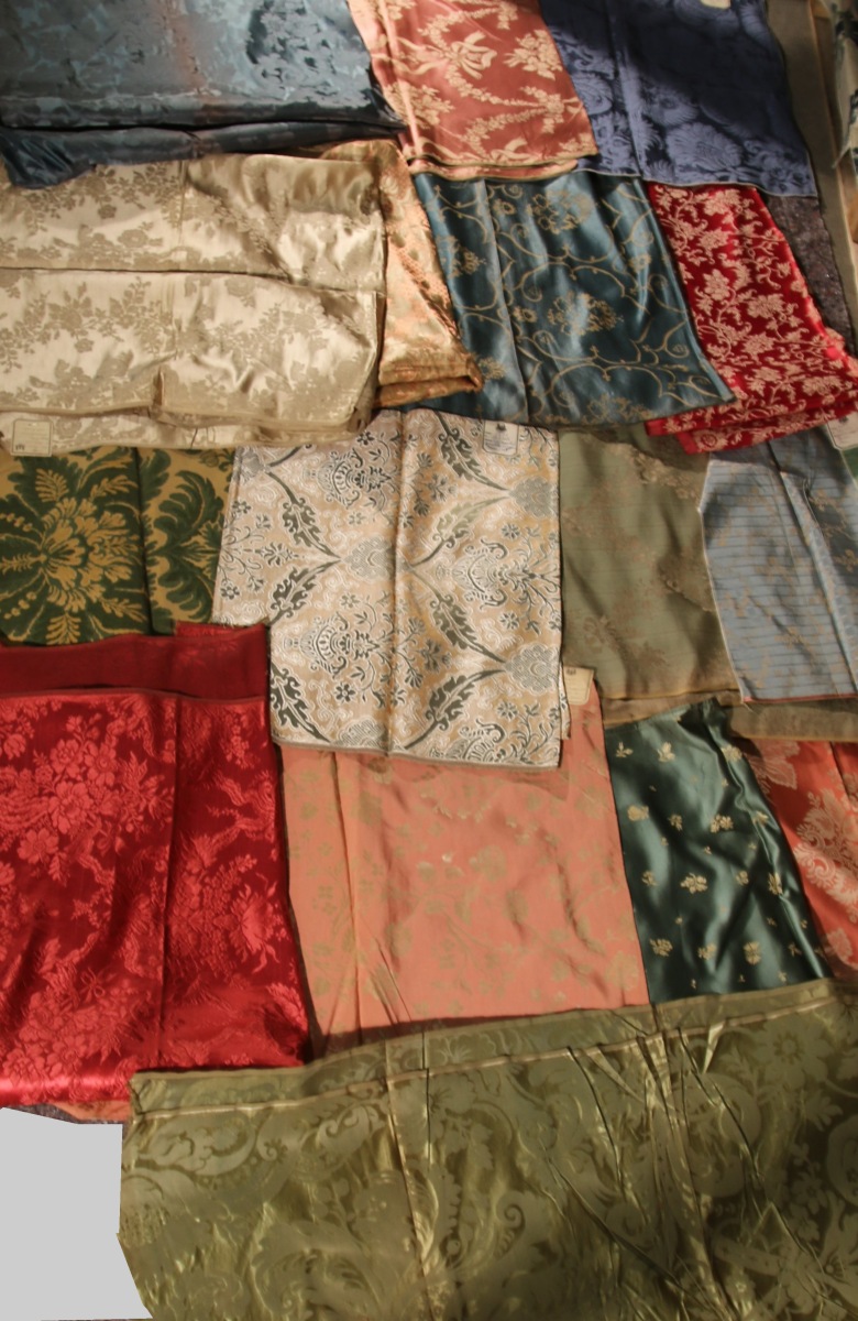Réunion de DAMAS, BROCATELLE, LAMPAS, gourgouran, style du XVIIIème siècle, jaune, bleu, vert, rouge et crème.