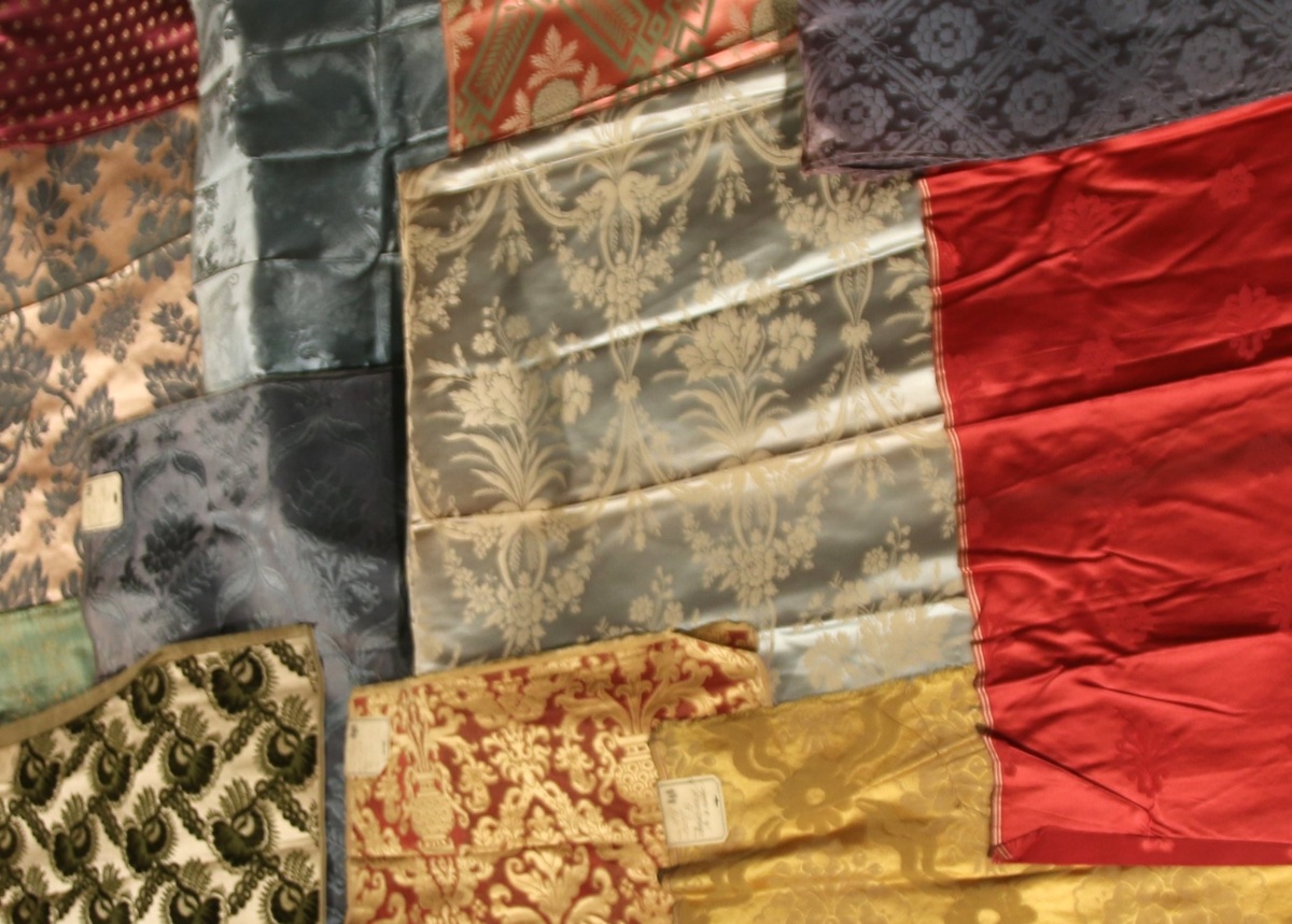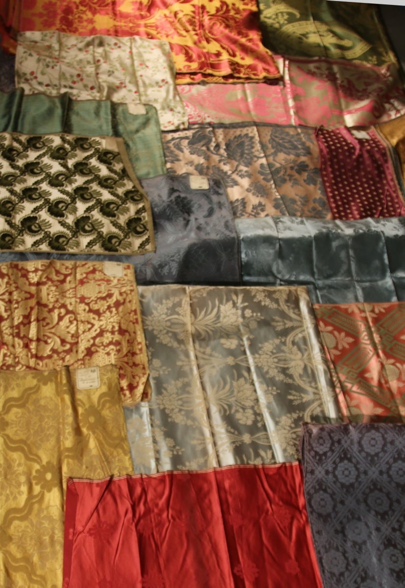Réunion de BROCATELLE, DAMAS, LAMPAS, velours cidelé, style Empire et du XVIIIème siècle, bleu, vert, rouge et crème.
