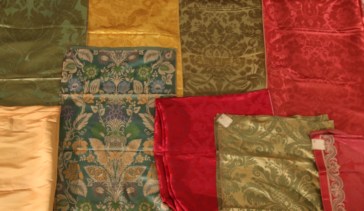 Réunion de DAMAS, LAMPAS, BROCATELLE, style du XVIIIème siècle, jaune, bleu, vert, rouge.