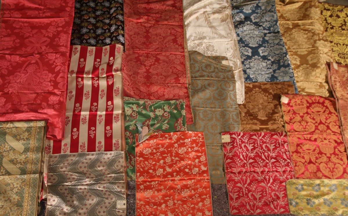 Réunion de DAMAS, LAMPAS, BROCATELLE, style Renaissance et du XVIIIème siècle, jaune, bleu, vert, rouge et crème.