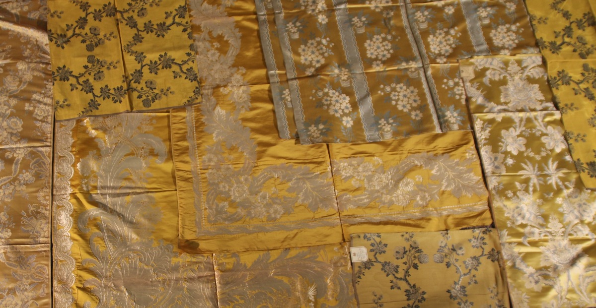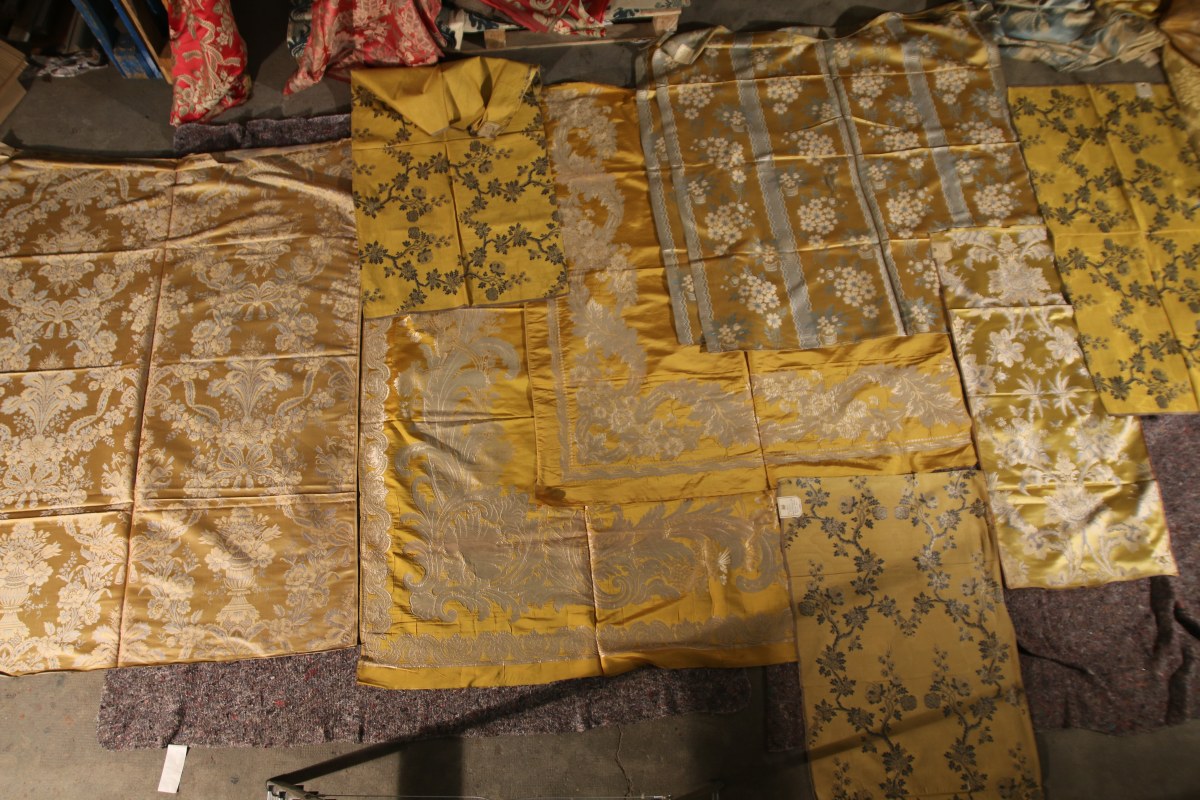 Réunion de LAMPAS et angles de RIDEAUX, style du XVIIIème siècle, à dominante jaune, fleurs, rinceaux, palmiers.