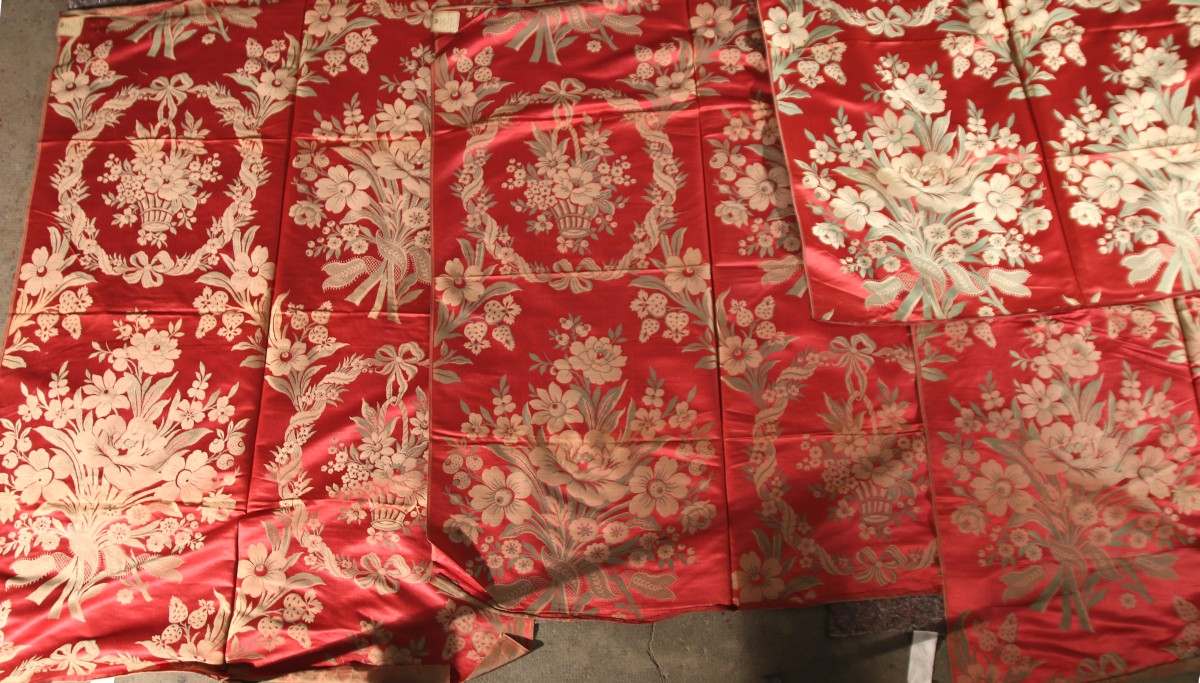 LAIZES DE LAMPAS, style du XVIIIème siècle, fond satin rouge, décor crème et vert d'une gerbe de fleurs nouée et d'un panier de fleurs dans une couronne de rubans et guirlande de fleurs (trois laizes et une quatrième présentant une légère différence de teinte).