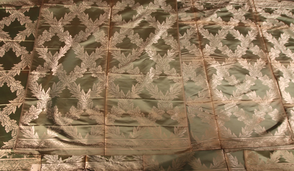 LAMPAS, fond satin ou gros de Tours vert, décor crème de branches laurée et feuilles de chêne (taches, usures). Sept laizes de différents tissages.