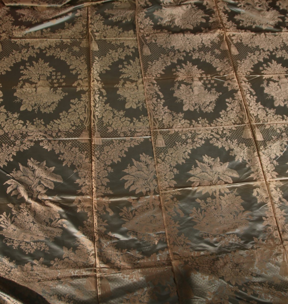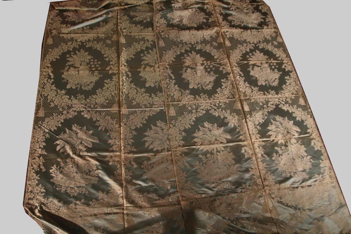 Deux grands LAMPAS dit " des quatre saisons " d'après Pernon, style du XVIIIème siècle, trophées de jardin avec oiseaux, arbres fruitiers, ruches et fleurs, dans des guirlandes de fleurs et glands.