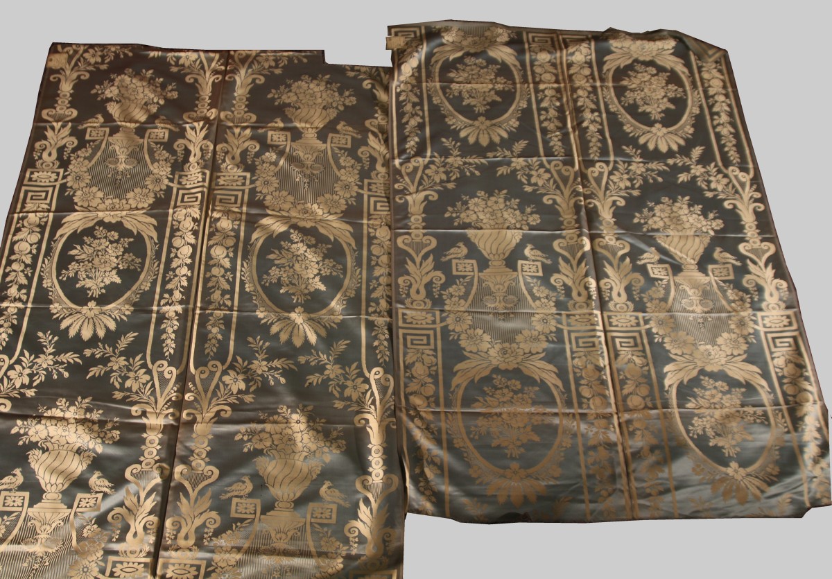 LAMPAS, style Louis XVI, fond satin bleu, décor crème effet argent d'un vase de fleurs entre des gerbes de fleurs dans des médaillons, bordure de candélabres et guirlandes de fruits.