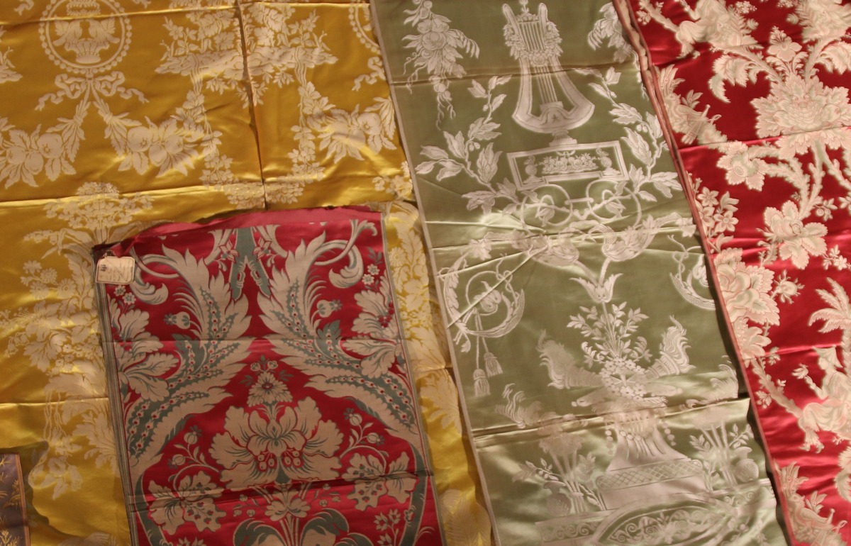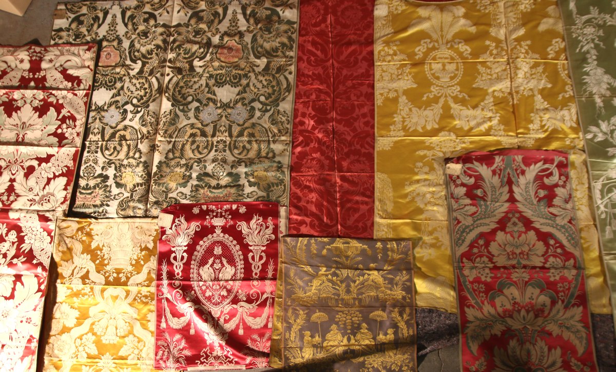 Réunion de DAMAS, LAMPAS, BROCATELLE, style du XVIIIème siècle, jaune, bleu, vert, rouge, chinois.
