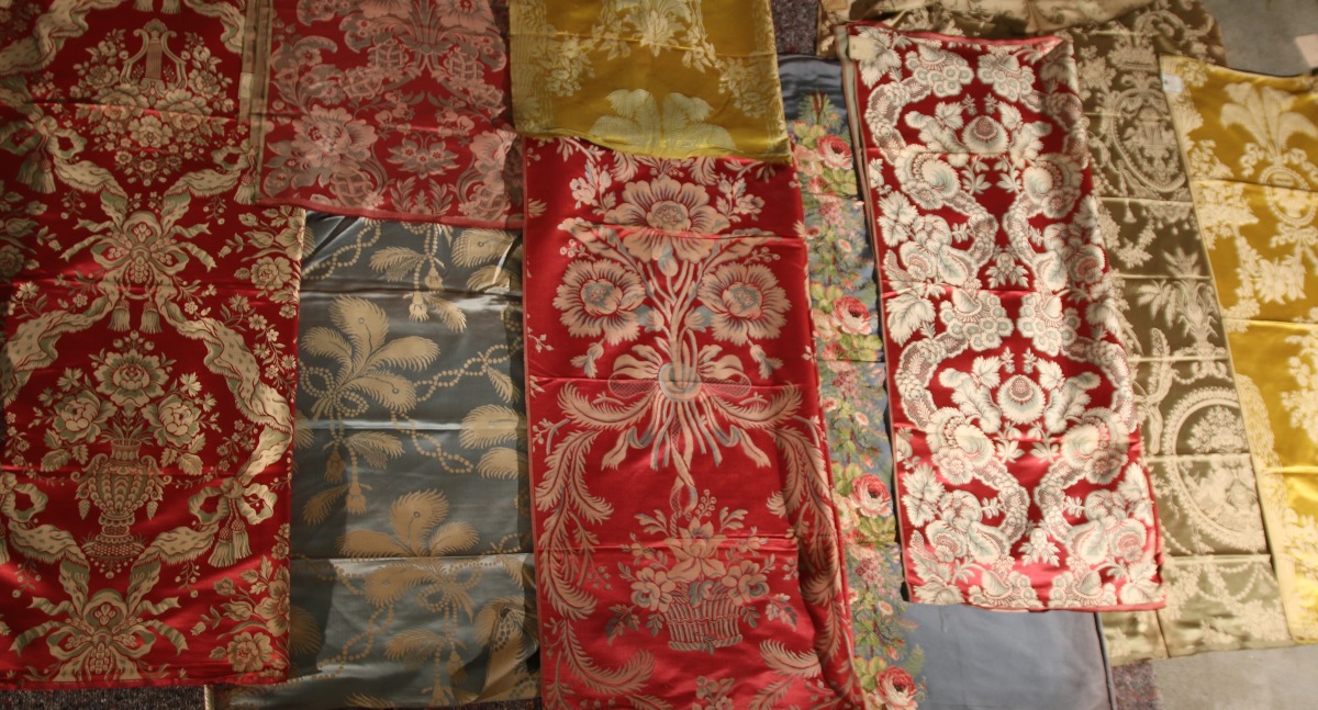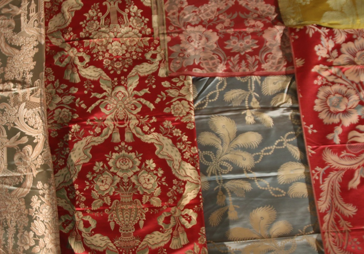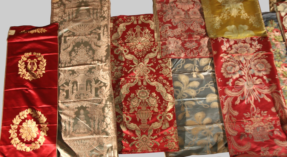 Réunion de DAMAS, LAMPAS, style Empire et du XVIIIème siècle, jaune, bleu, rouge.