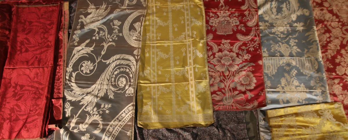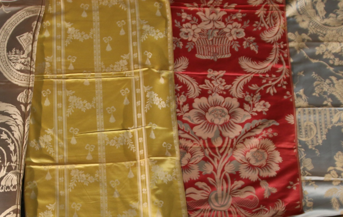 Réunion de DAMAS, LAMPAS, BROCATELLE, style du XVIIIème siècle, jaune, bleu, rouge.