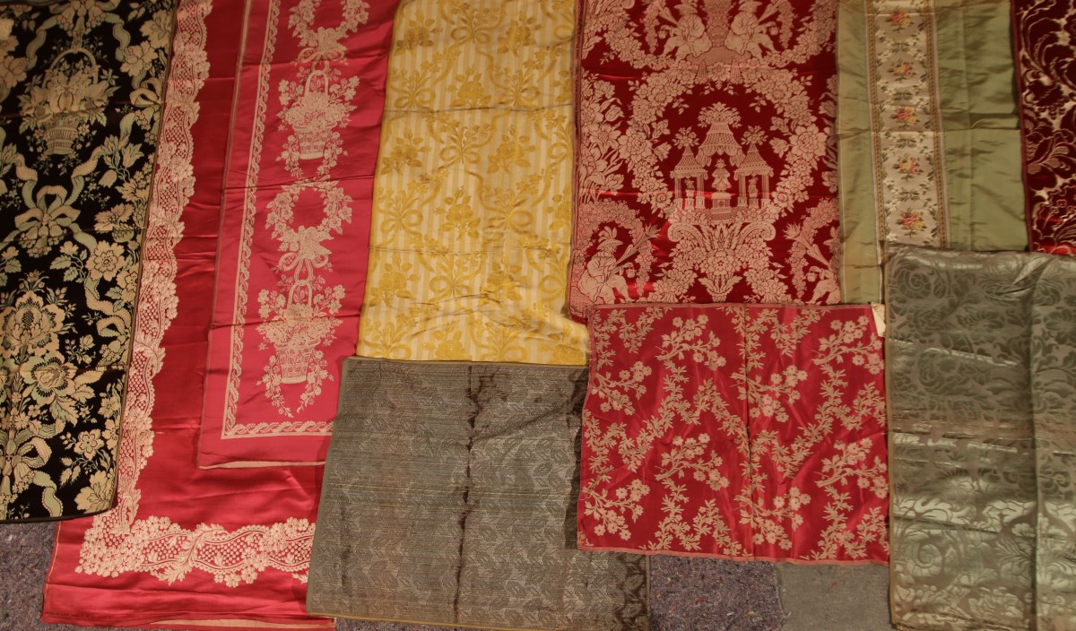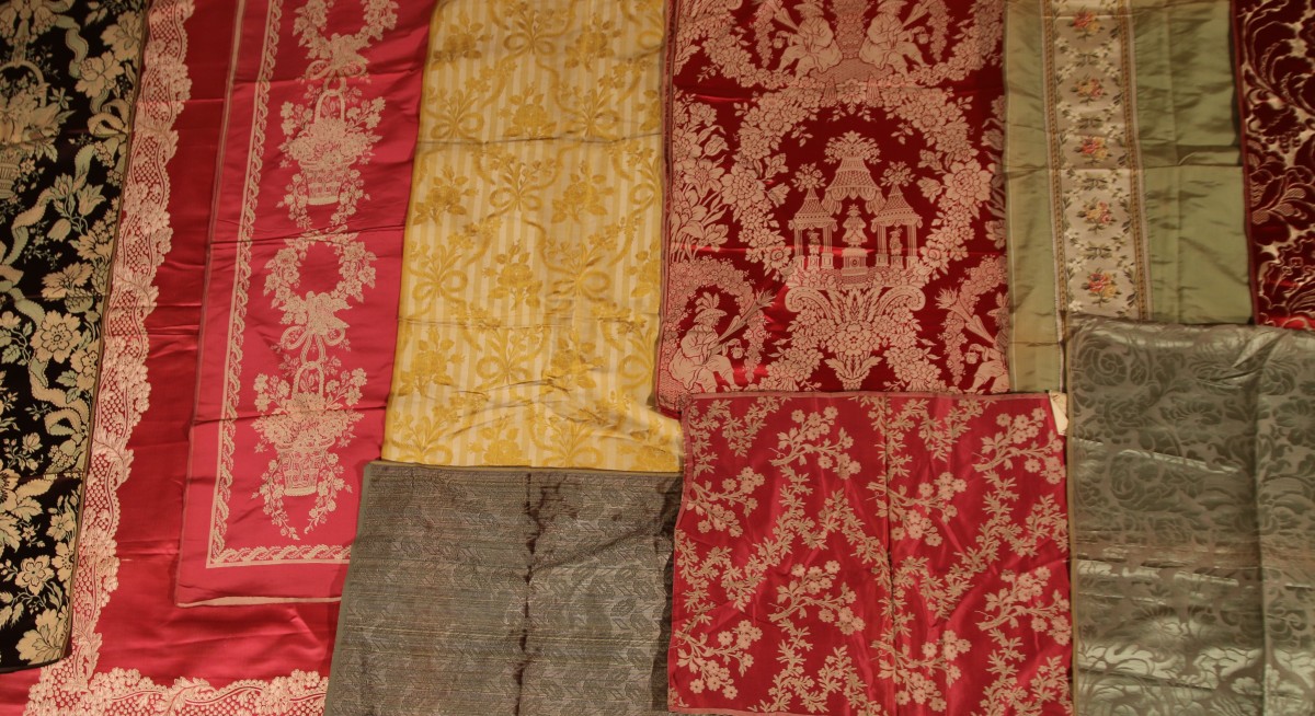Réunion de lampas, brocatelle style du XVIIIème siècle et Empire, rouge, jaune, vert, crème, marron, rubans, rayures, fleurs, chinois.