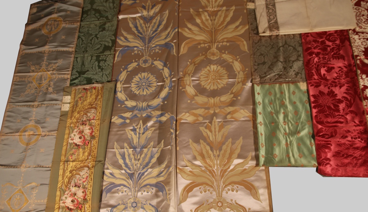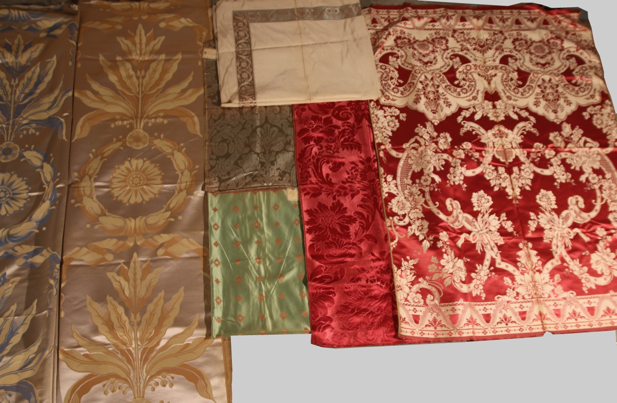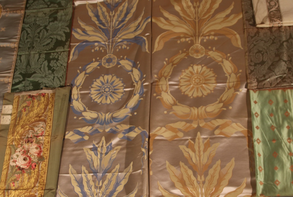 Réunion de lampas, damas style du XVIIIème siècle, Directoire et Empire, bleu, or, vert, argent, bleu, jaune, crème, orange, instruments de musique, fleurs.