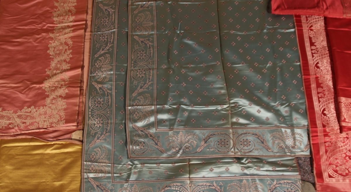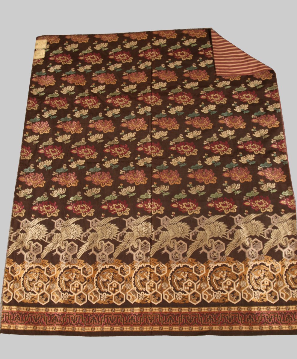 Réunion de lampas, damas style du XVIIIème siècle, japonisant, jaune, crème, rouge, rose, bleu, vigne, fleurs et guirlandes, grues, dragons. Dont deux laizes bleues en damas, à bordures rapportées en lampas, quatre laizes aux bordures fleuries (Un jaune, deux rouges d'une même teinte, un autre d'une teinte rouge différente)