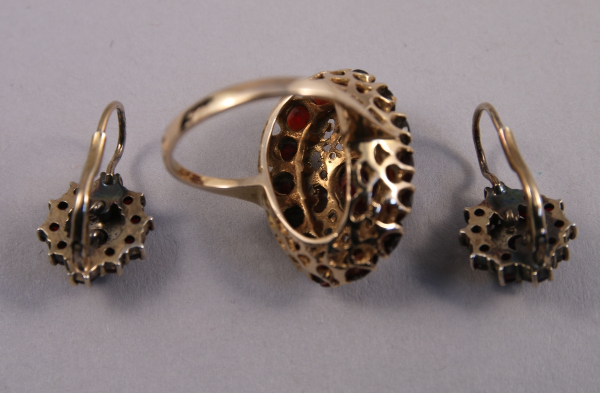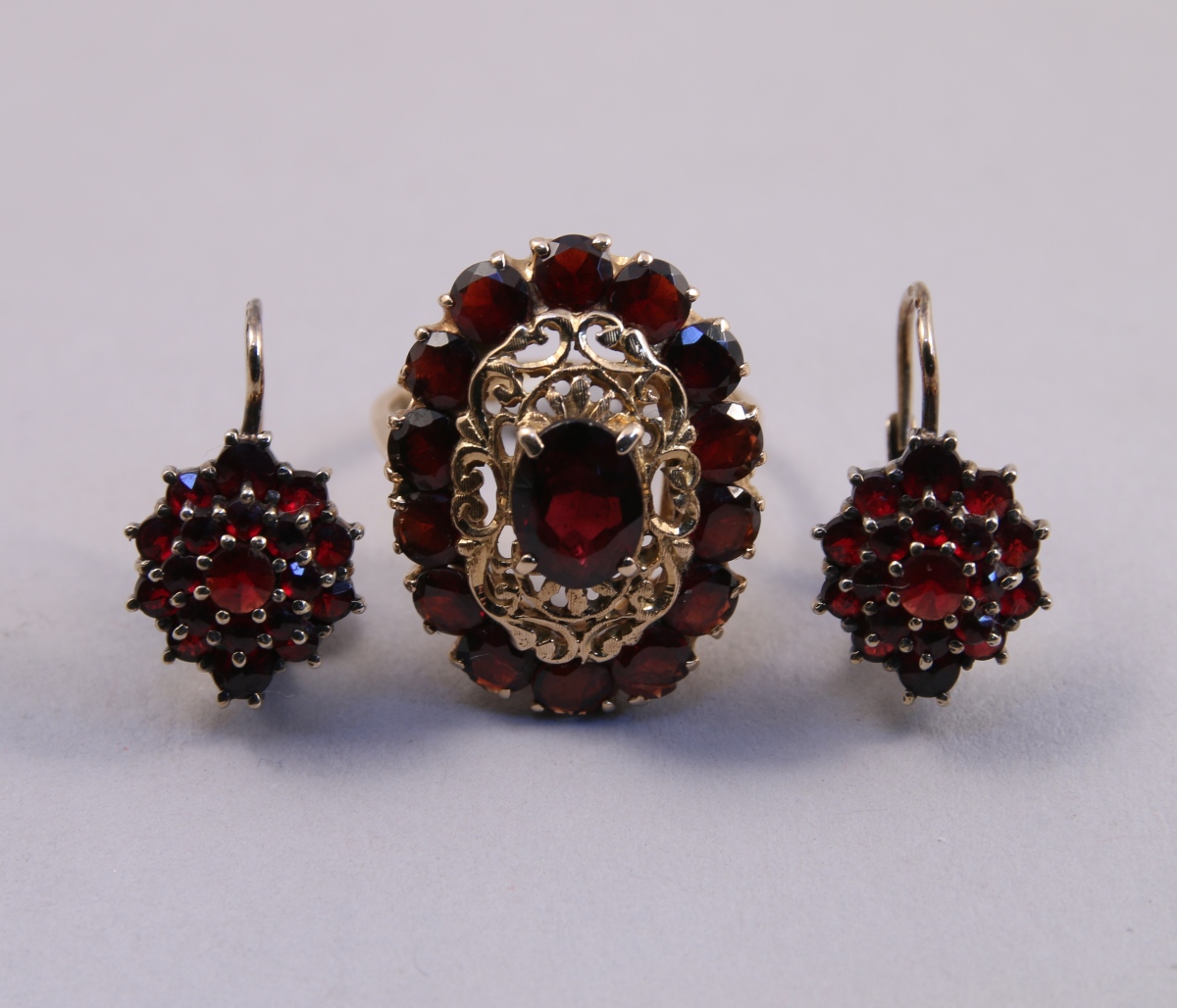 PARURE en GRENAT composé d'une bague en or jaune et d'une paire de boucles d'oreilles en vermeille.