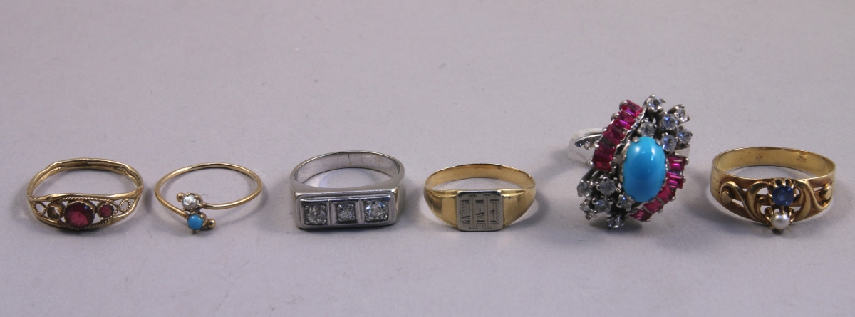 6 BAGUES en or jaune et en or blanc, l'une ornée de 3 DIAMANTS, 4 ornées de pierres.