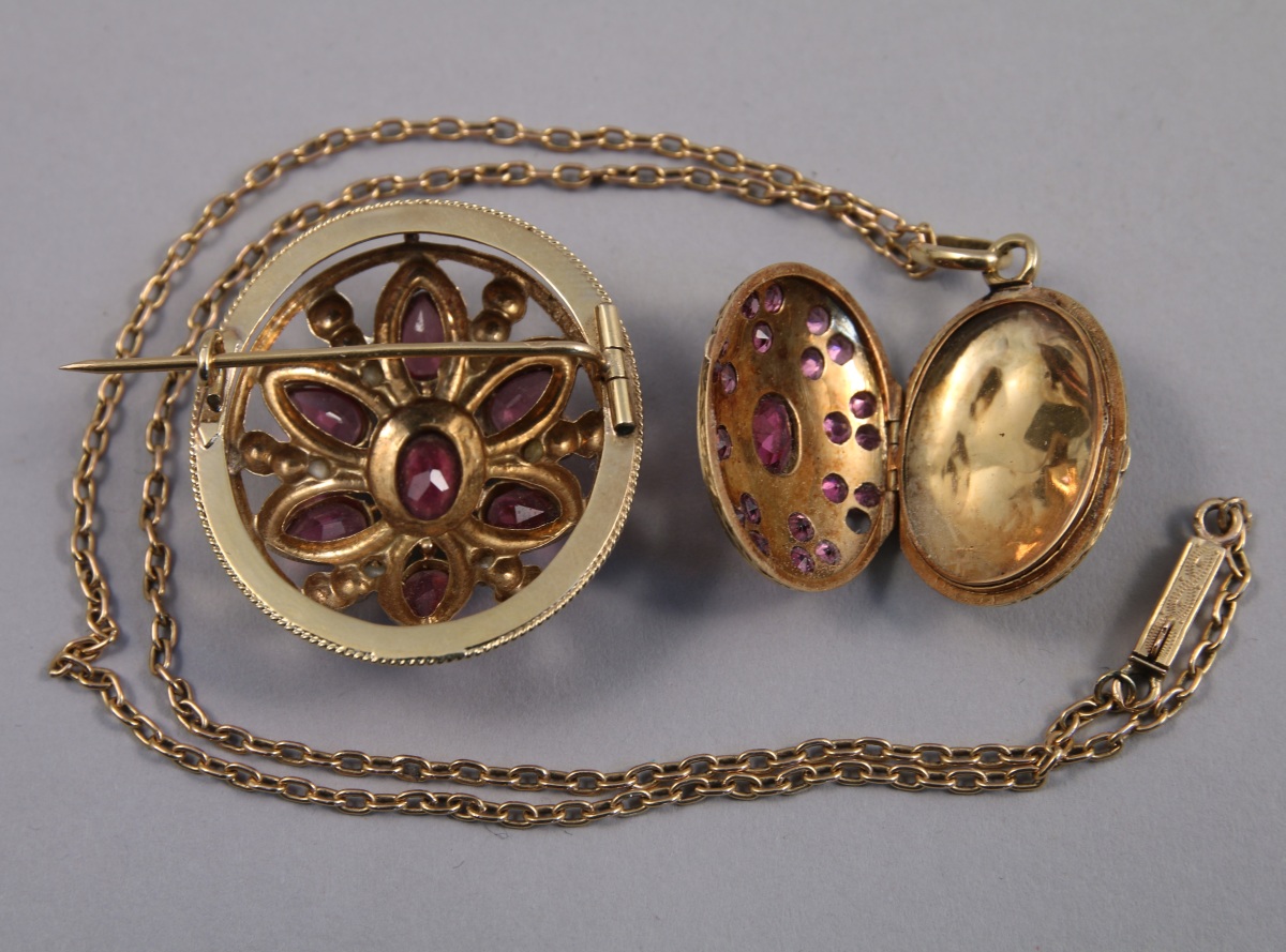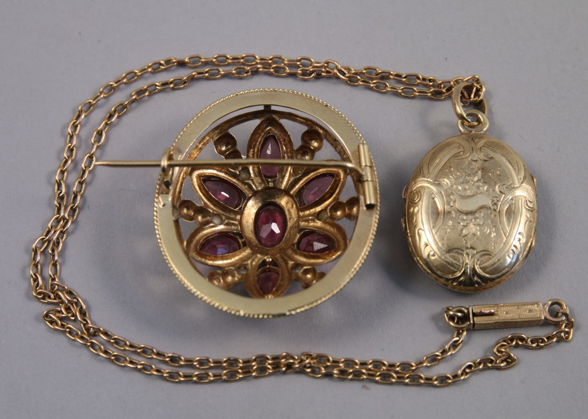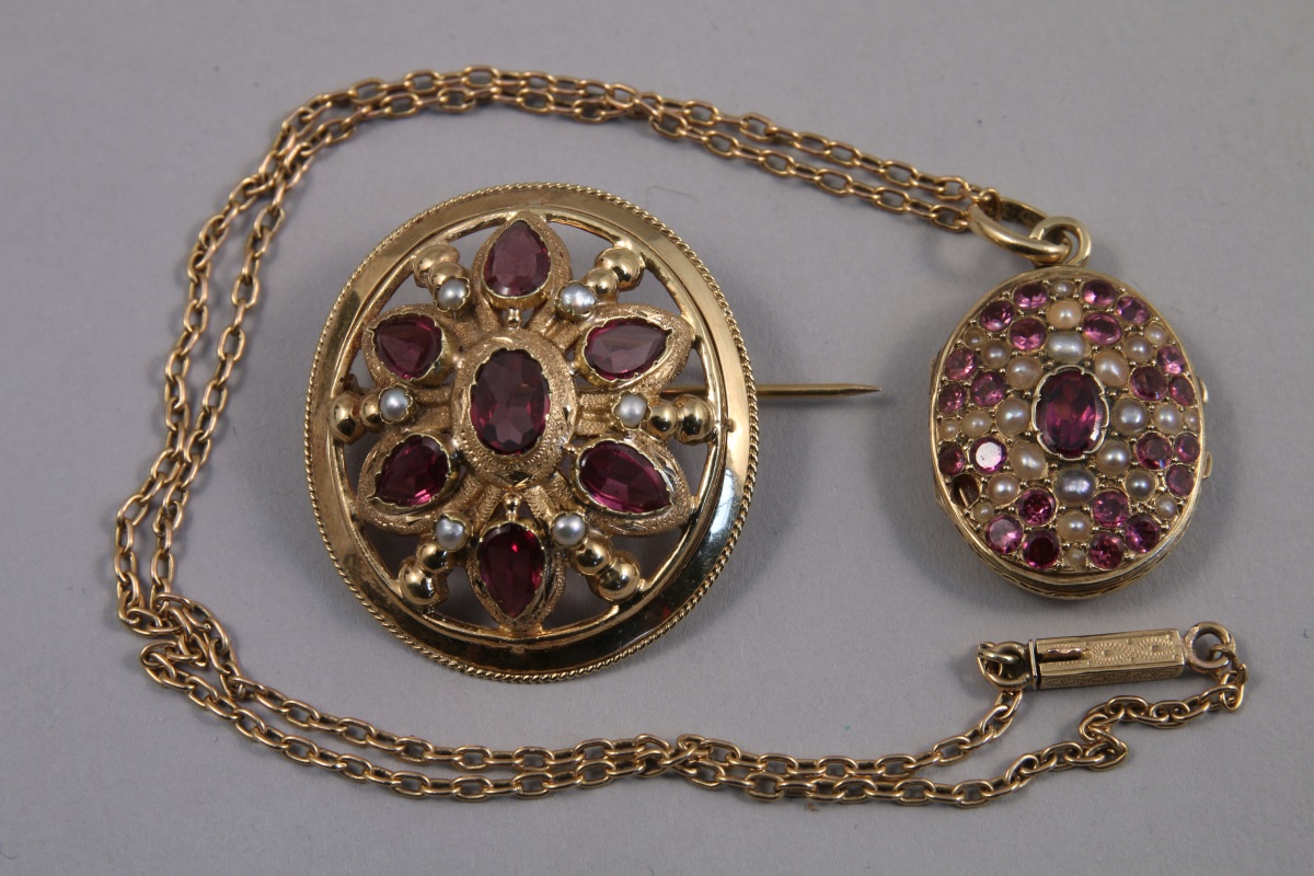JOINT : MÉDAILLON RELIQUAIRE en or jaune de forme ovale orné de perles et pierres orsée, retenu par une chaîne en or. Haut. 25 mm. Poids brut 12,1 g.