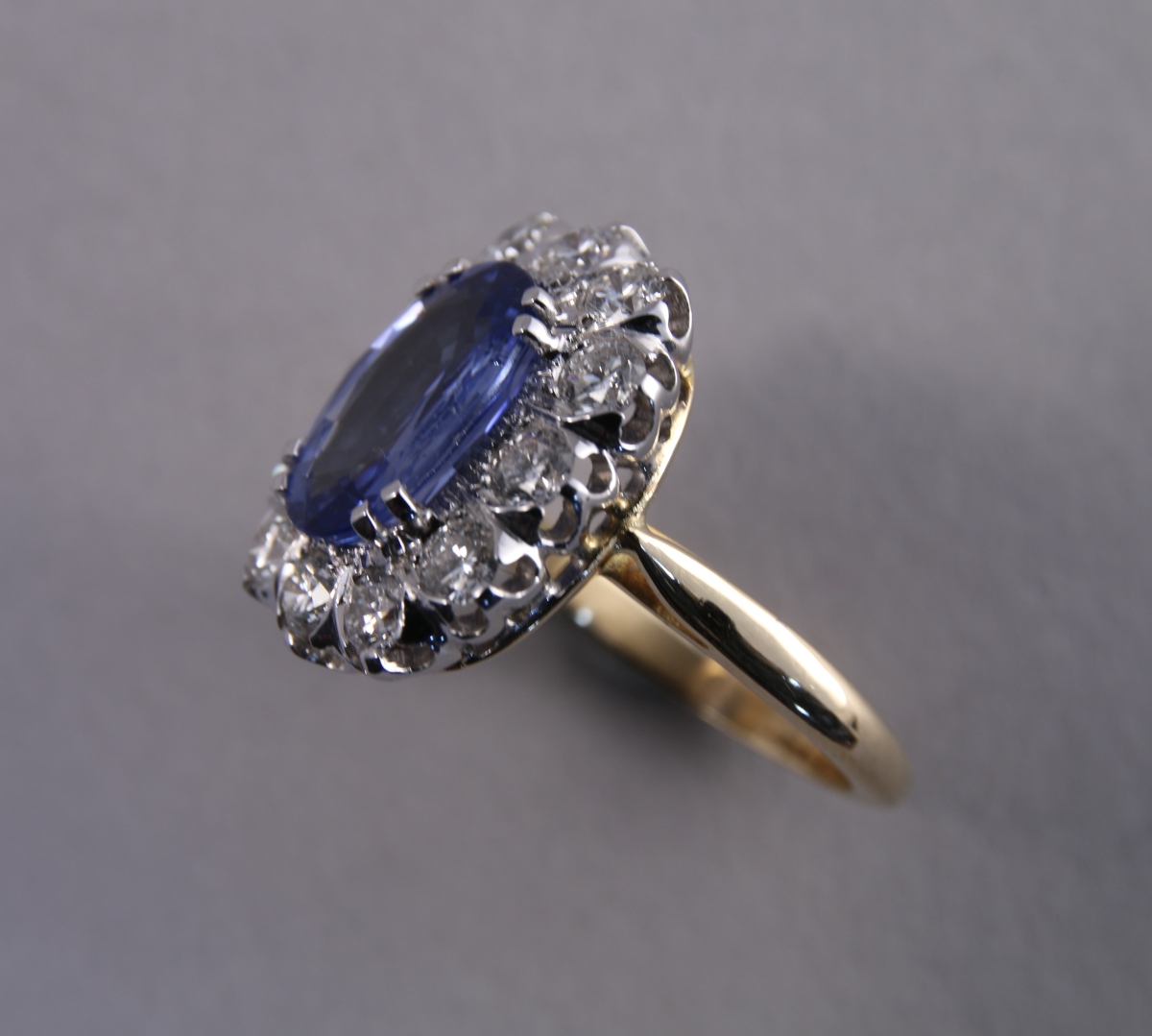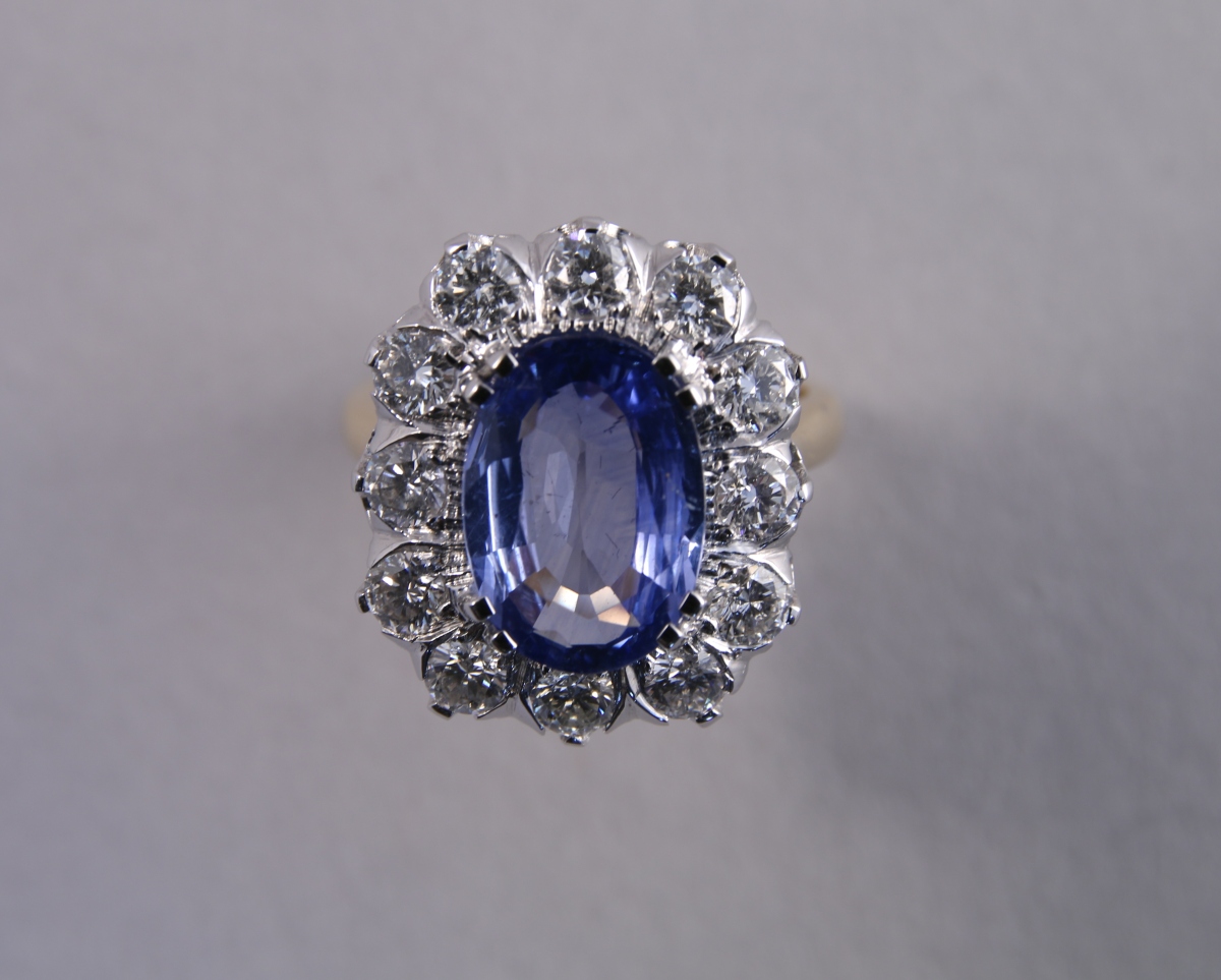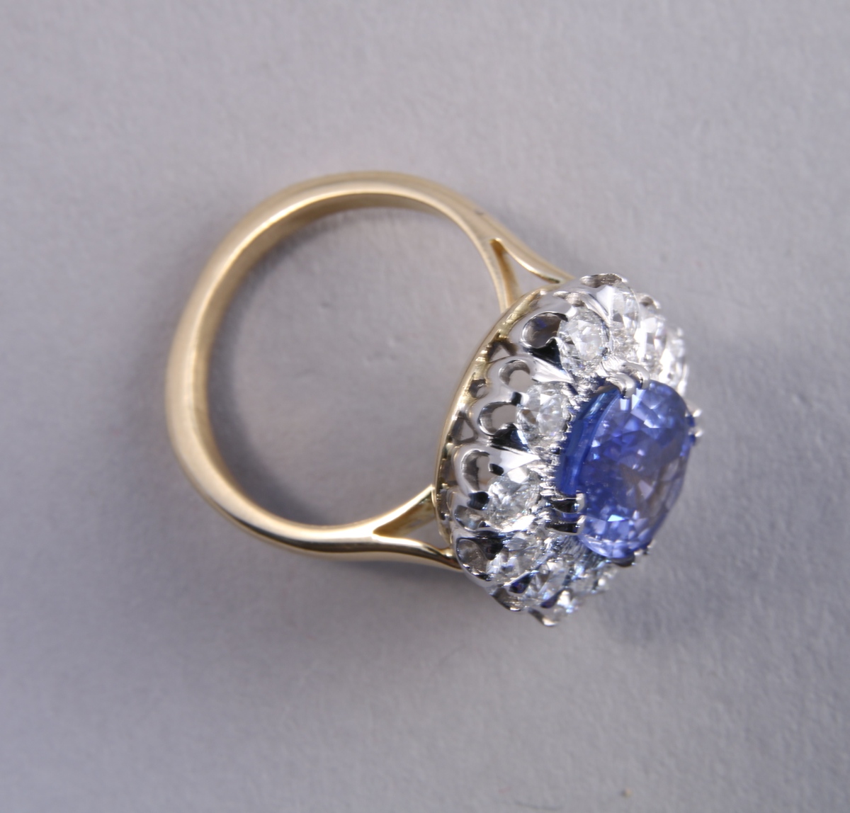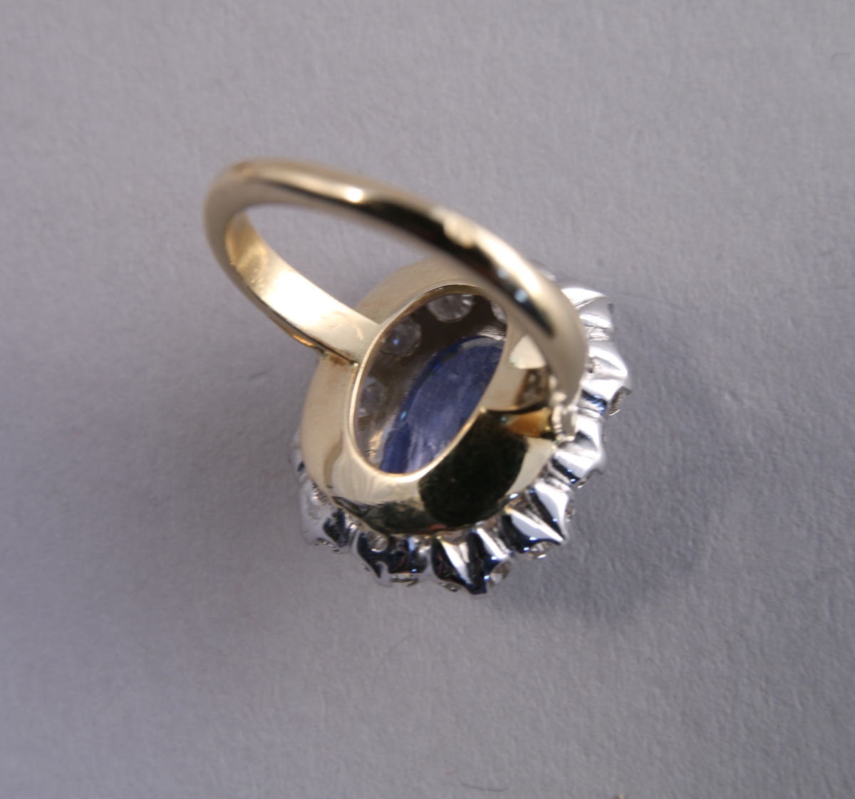 BAGUE COUSSIN en or de deux tons, sertie au centre d'un SAPHIR (probablement Ceylan) taille ovale de 4,95 carats environ, dans une entourage de 12 DIAMANTS blancs taille moderne d'environ 1,65 carats.