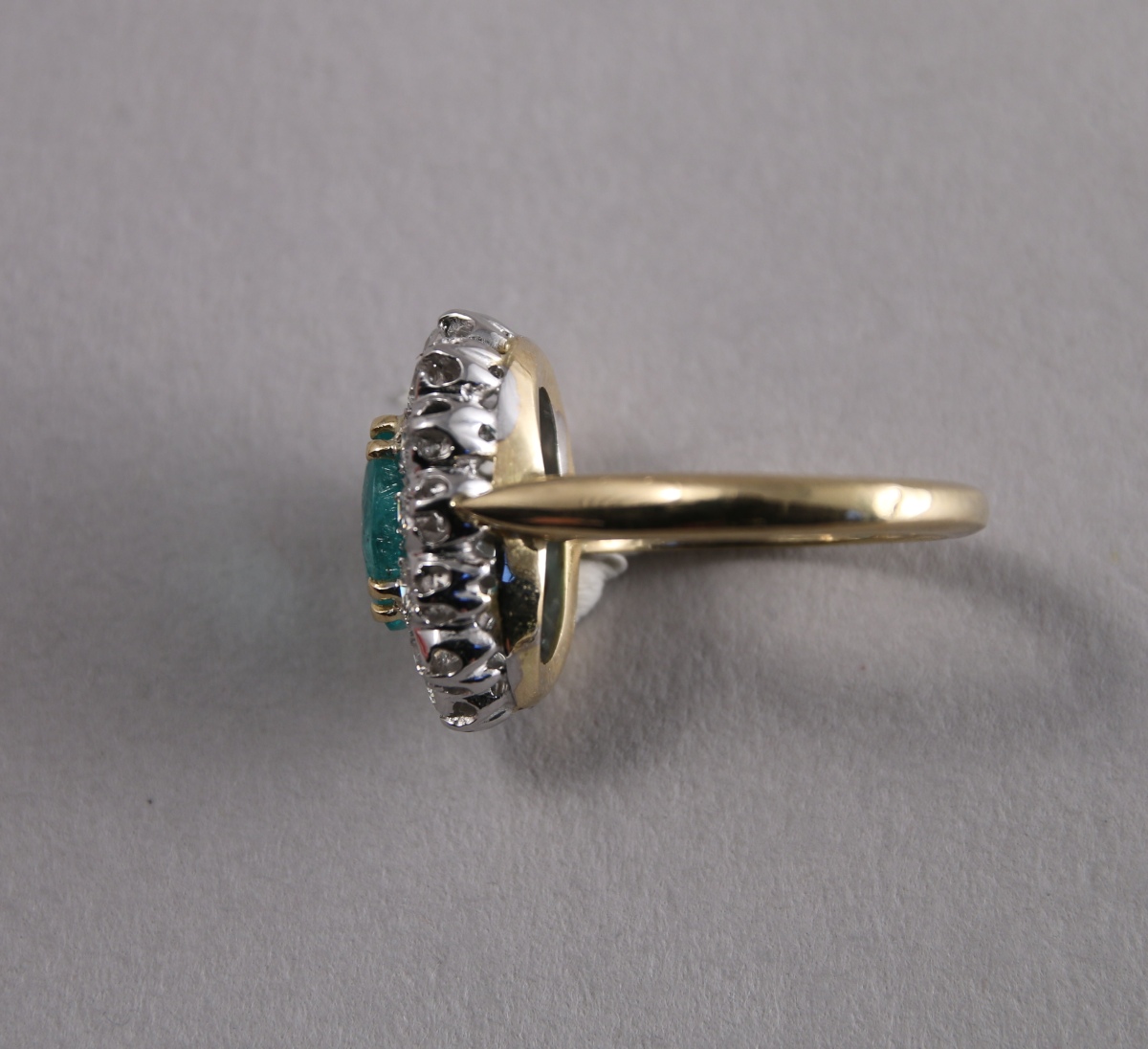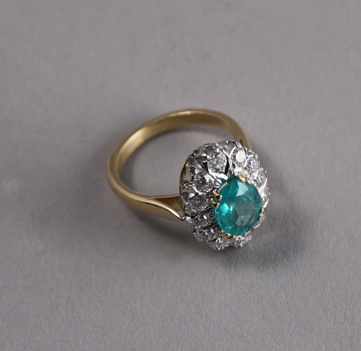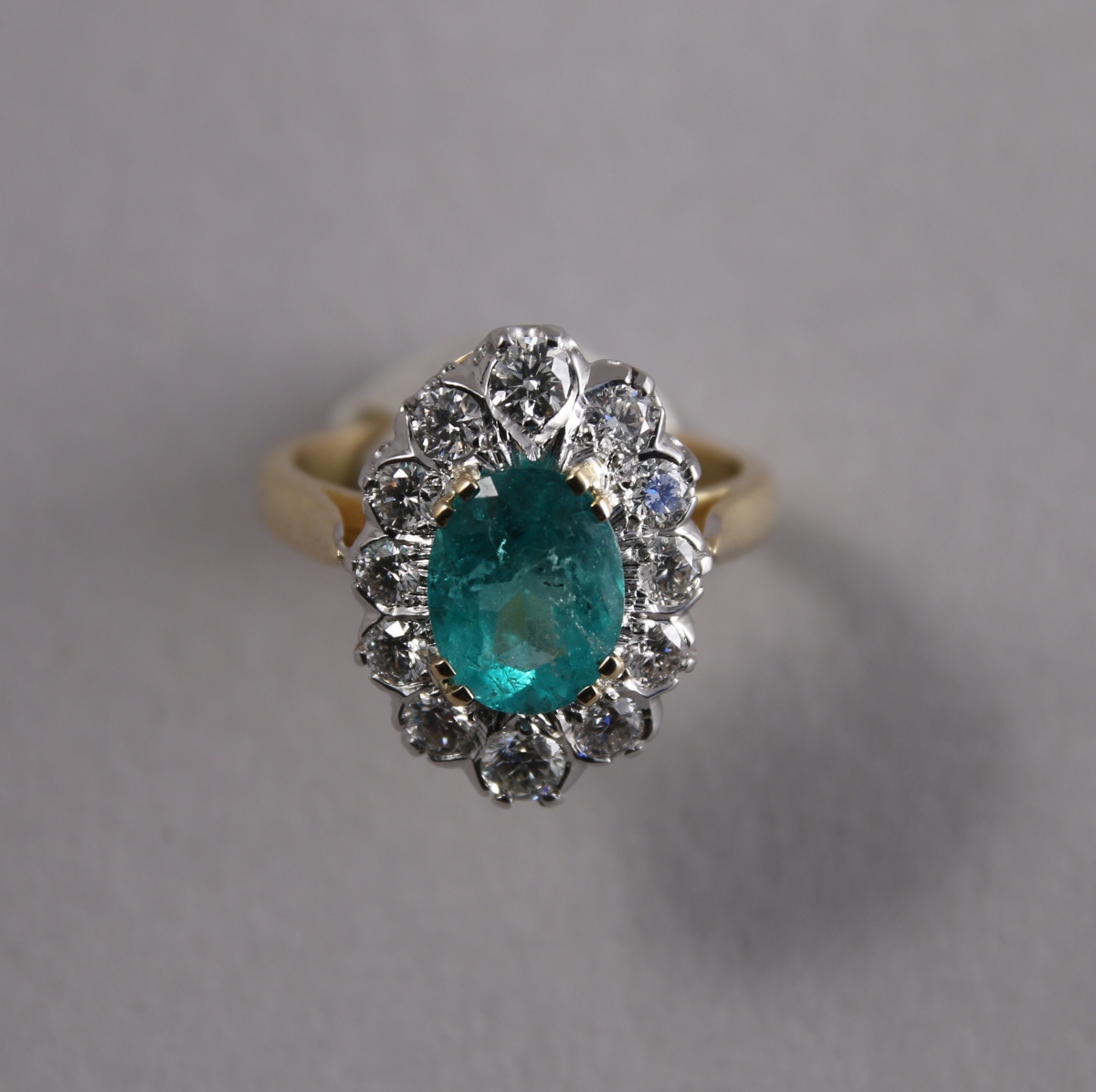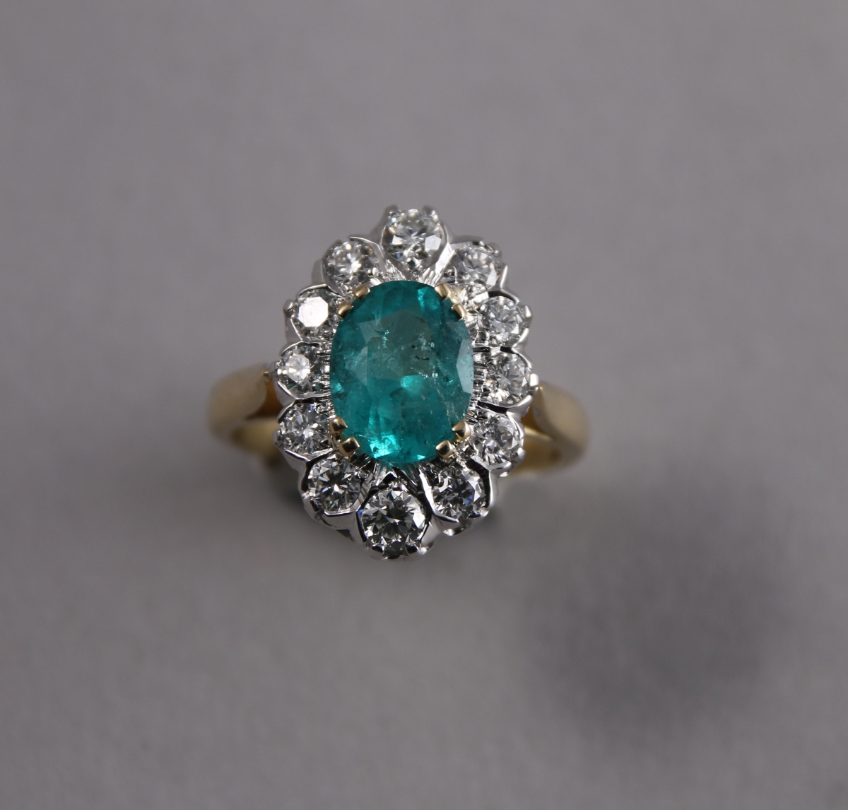 BAGUE POMPADOUR en or de deux tons, sertie au centre d'une ÉMERAUDE (probablement Colombie) taille ovale d'environ 1,65 carats, entouré de 12 DIAMANTS blancs taille moderne d'environ 0,90 carat.