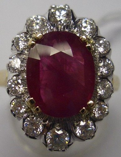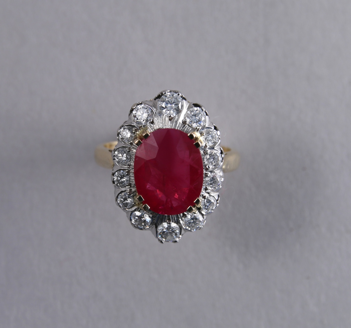 BAGUE POMPADOUR en or de deux tons, ornée en son centre d'un RUBIS (probablement Birman) taille ovale de 3,65 carats environ, entouré de 14 DIAMANTS blancs taille moderne d'environ 0,95 carat.
