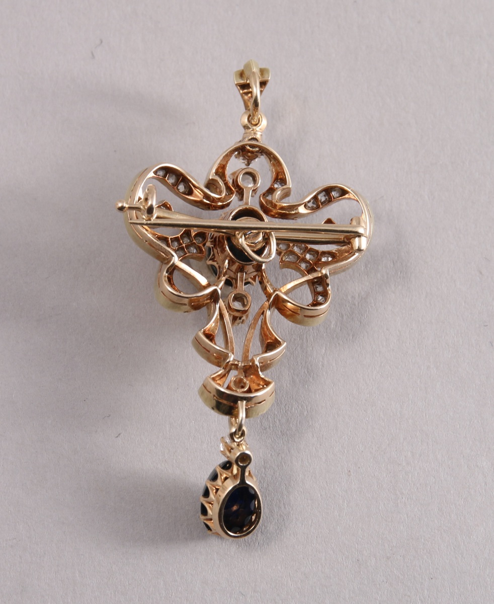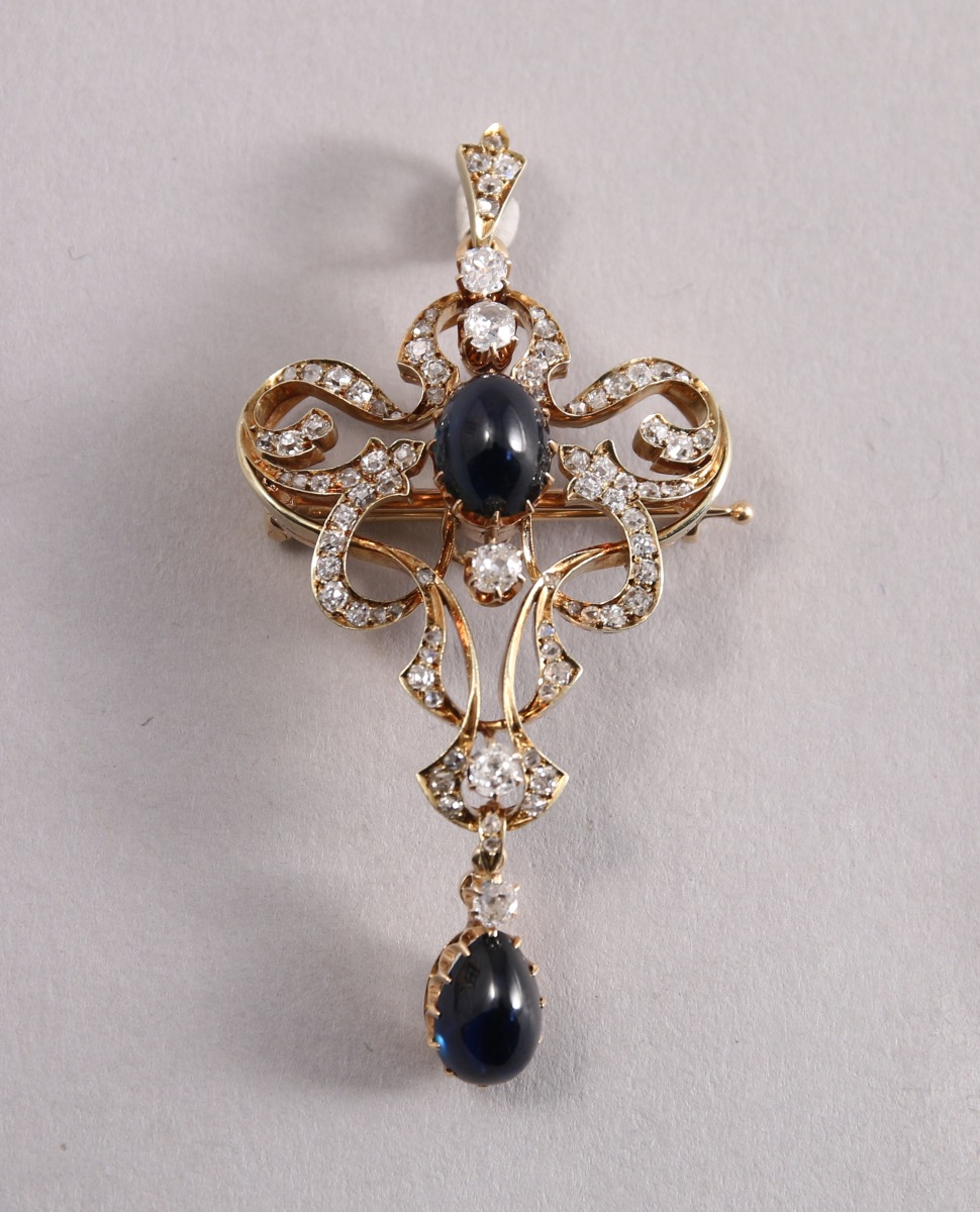 BROCHE pouvant former pendentif, en or jaune 750 millièmes, à décor d'entrelacs, ornée de DIAMANTS de taille ancienne et de deux SAPHIRS cabochon, un en pampille.