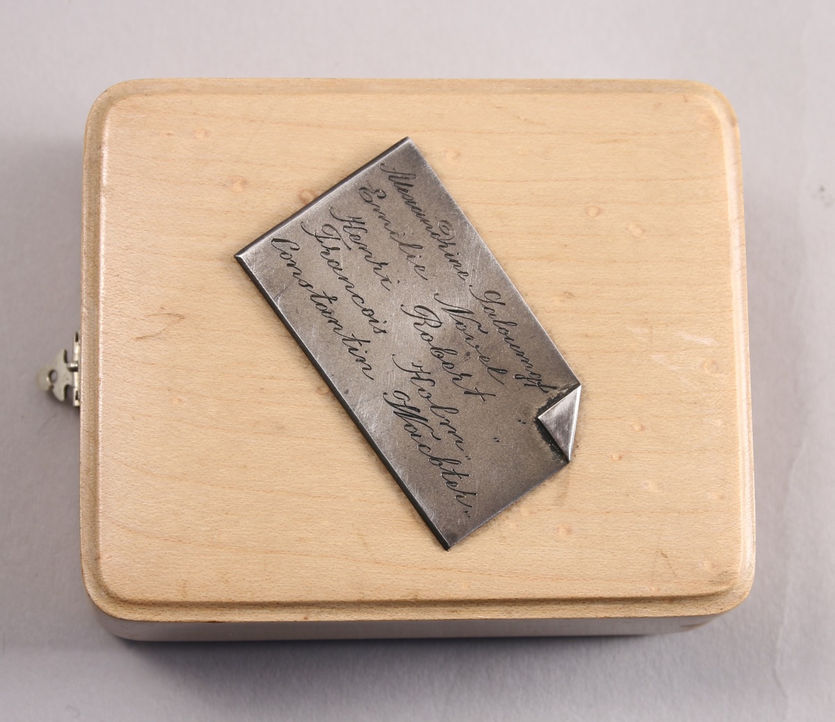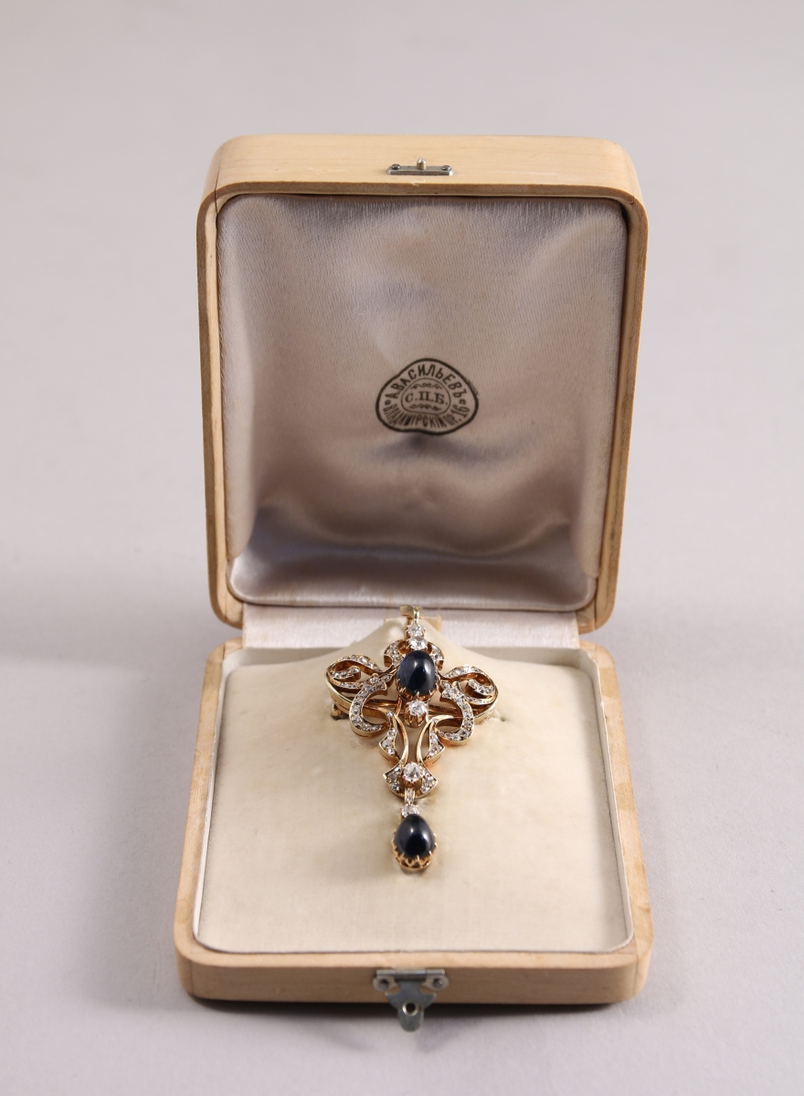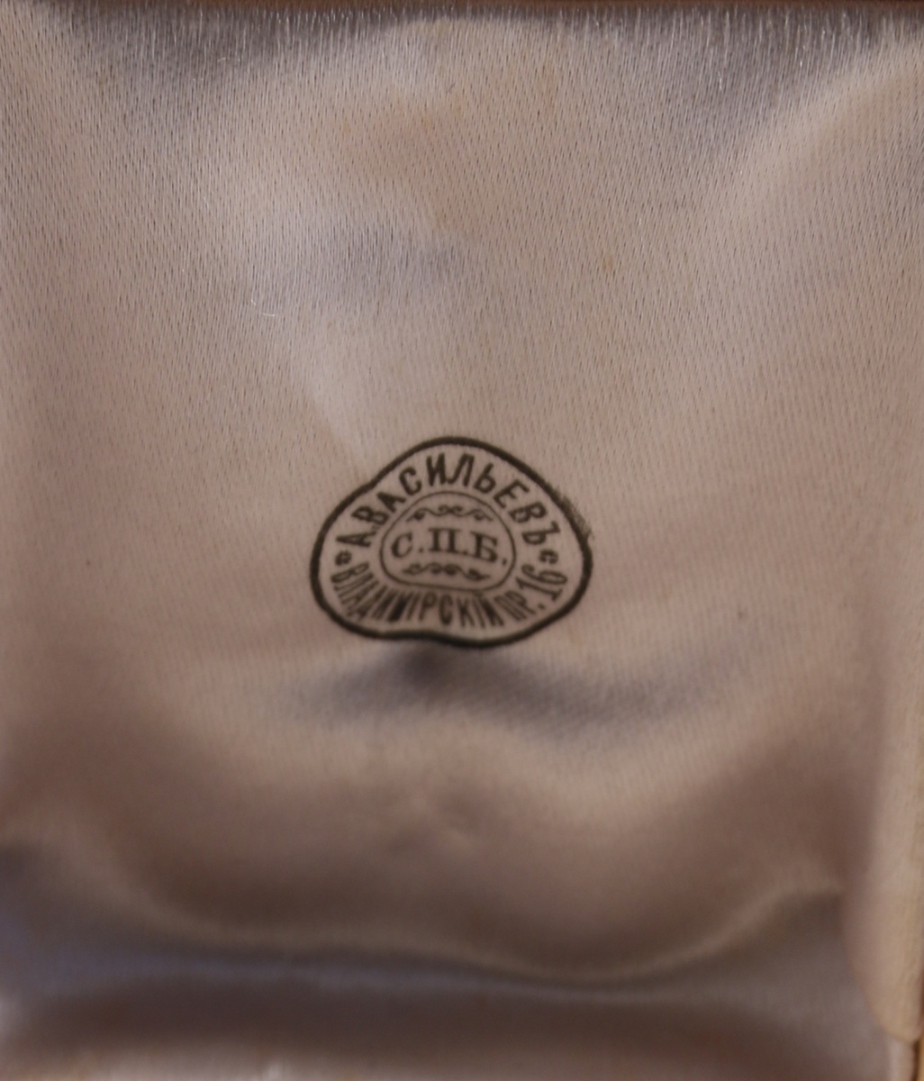 Dans son ÉCRIN marqué "A. VASSILIEV, 16 Vladmimir Prospekt, Saint-Petersbourg" en bois clair avec, gravé sur une plaque de métal, les noms de "Alexandrine Saloumgf, Emilie Novet, Henri Robert, François Holm, Constantin Wachter."
