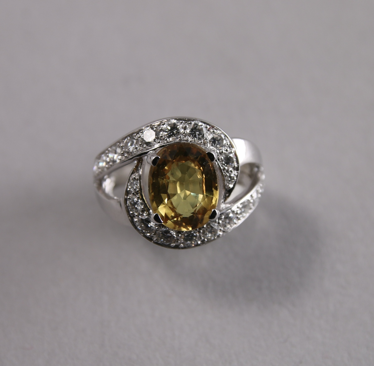 BAGUE TOURBILLON en or blanc, ornée au centre d'un SAPHIR jaune traité, taille ovale d'environ 3,45 carats, agrémenté de 20 DIAMANTS blancs taille moderne d'enviton 1 carat.