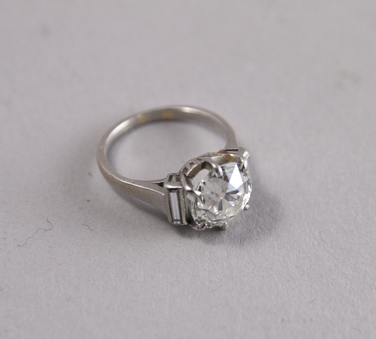BAGUE en platine 850 millièmes, ornée au centre d'un DIAMANT rond de taille ancienne entre deux diamants baguettes.