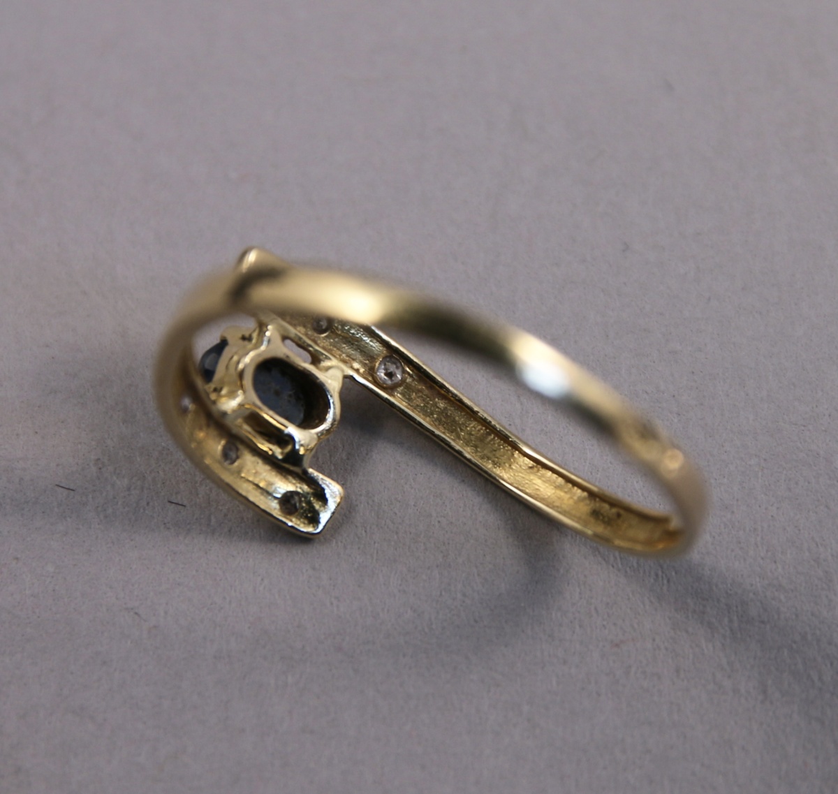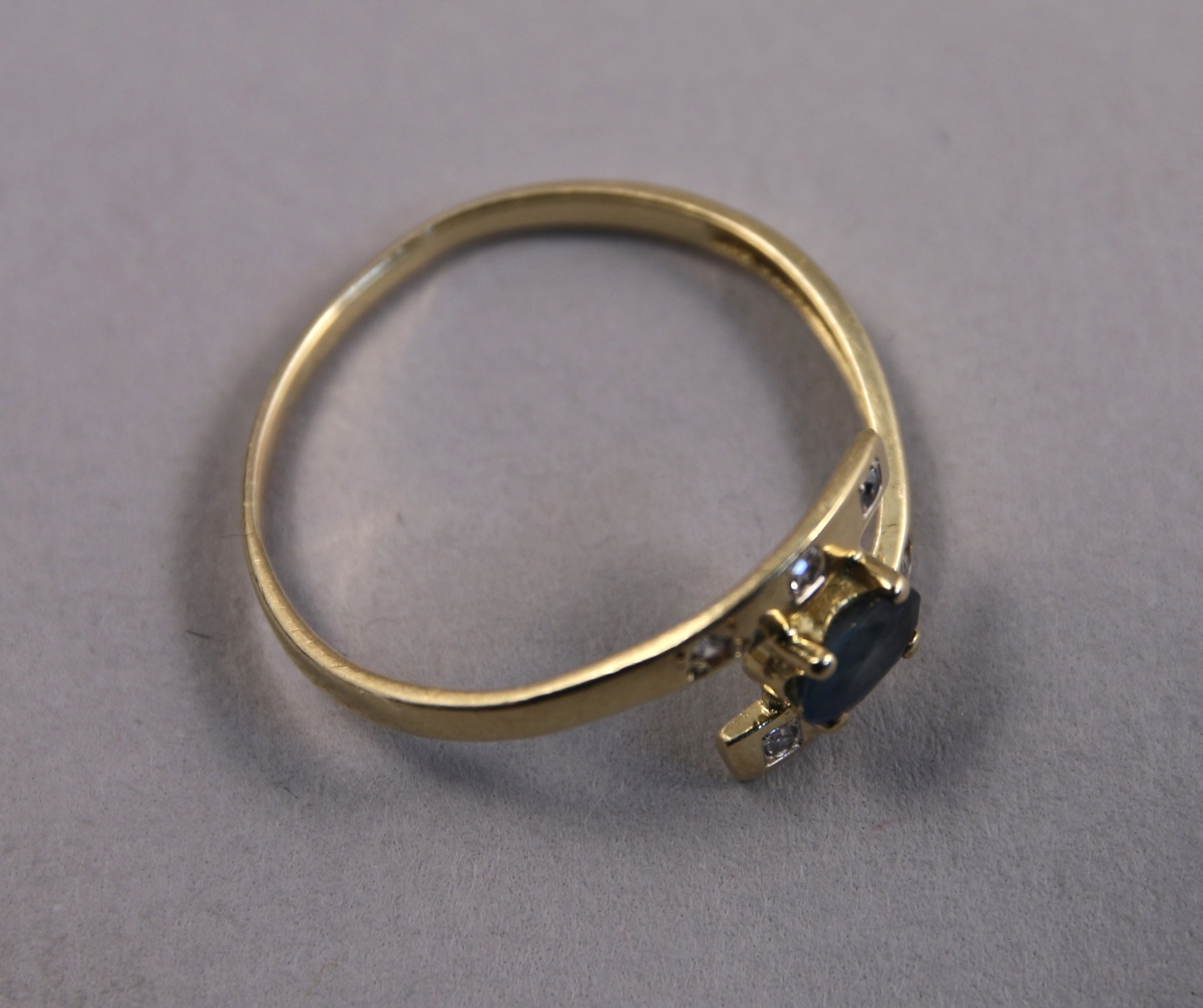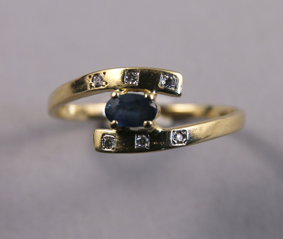 BAGUE en or jaune ornée d'un SAPHIR et de six petits BRILLANTS.
