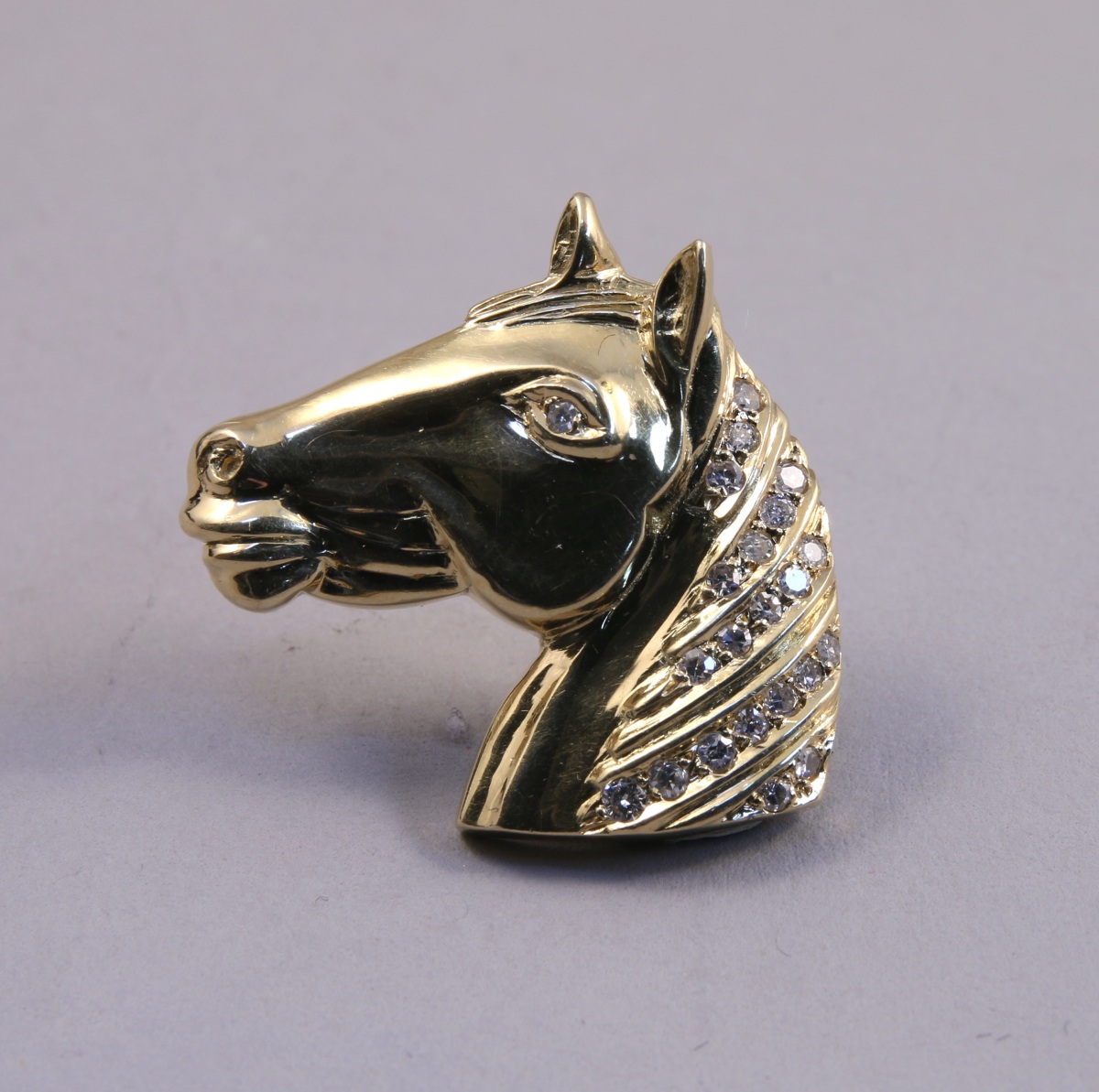 PENDENTIF TÊTE DE CHEVAL en or jaune et brillant. Modèle unique d'après la tête de Saphir, cheval pie.