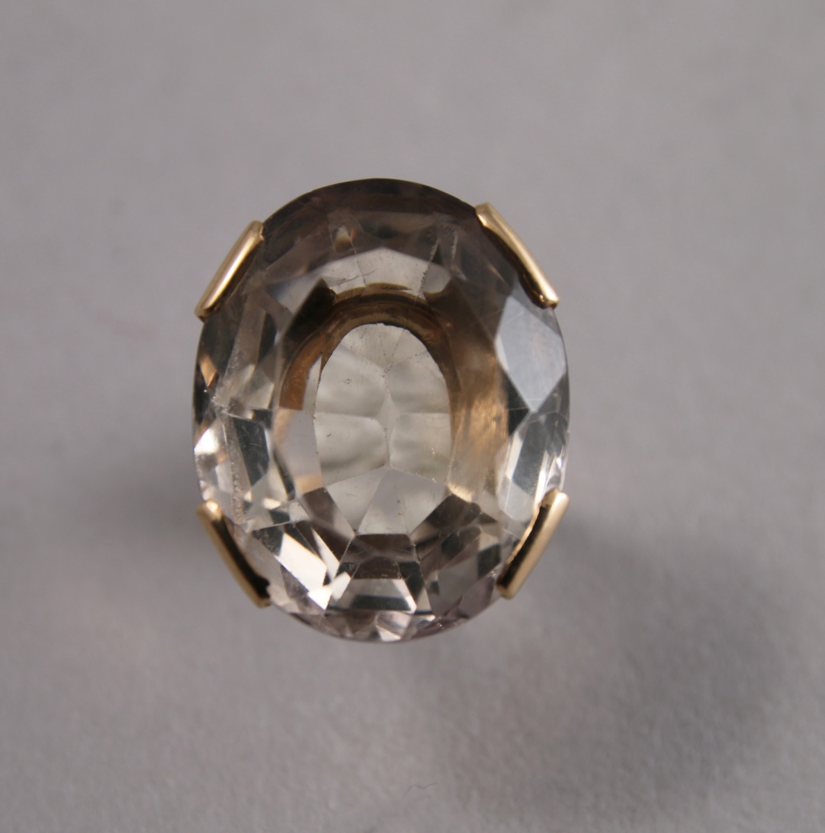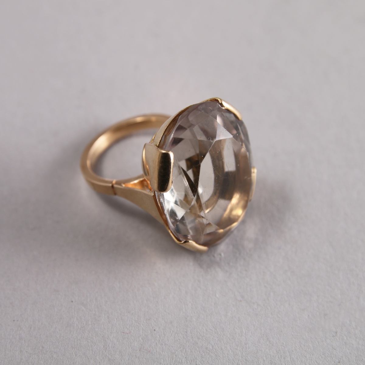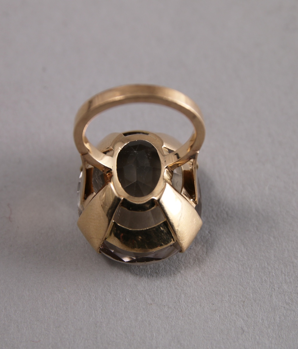 BAGUE en or jaune sertie d'une importante pierre fine (quartz, citrine ?) de taille ovale.