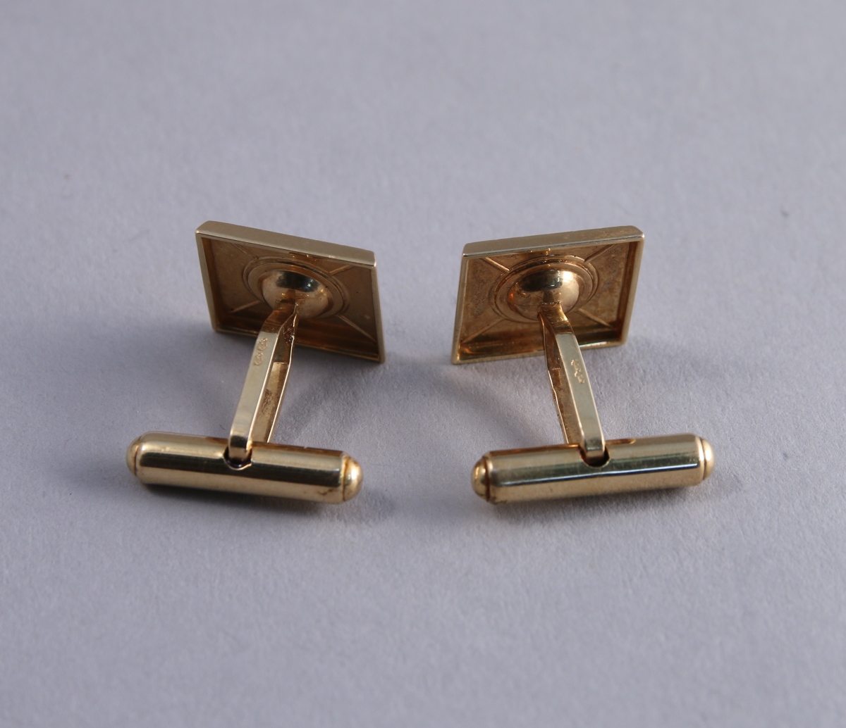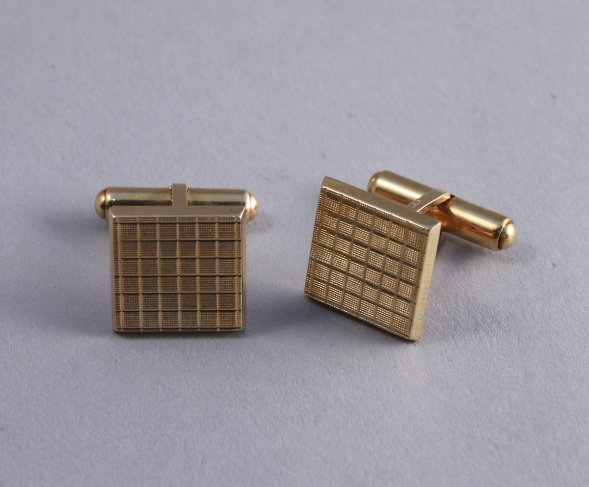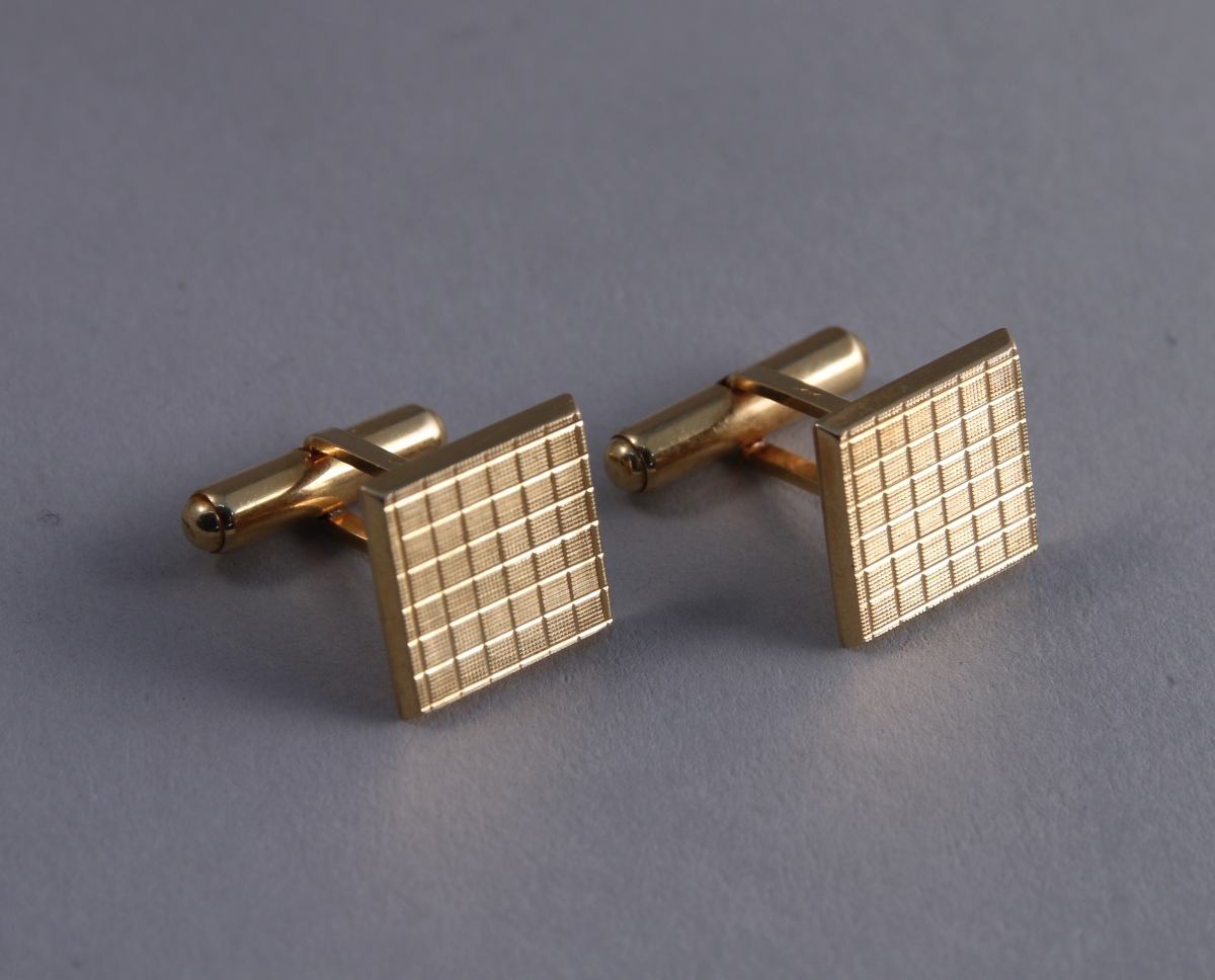 PAIRE de BOUTONS DE MANCHETTES en or jaune. Plateau de forme carrée à décor quadrillé. Poinçon tête d'aigle.
