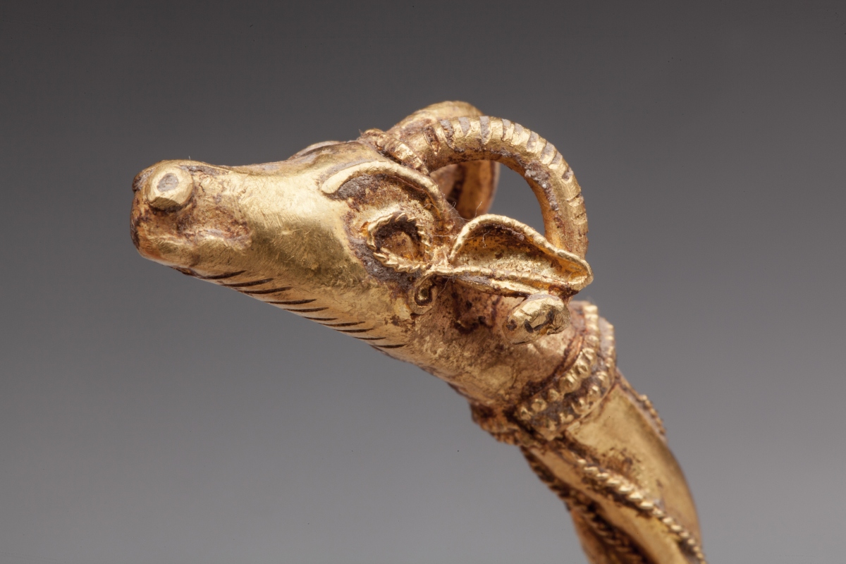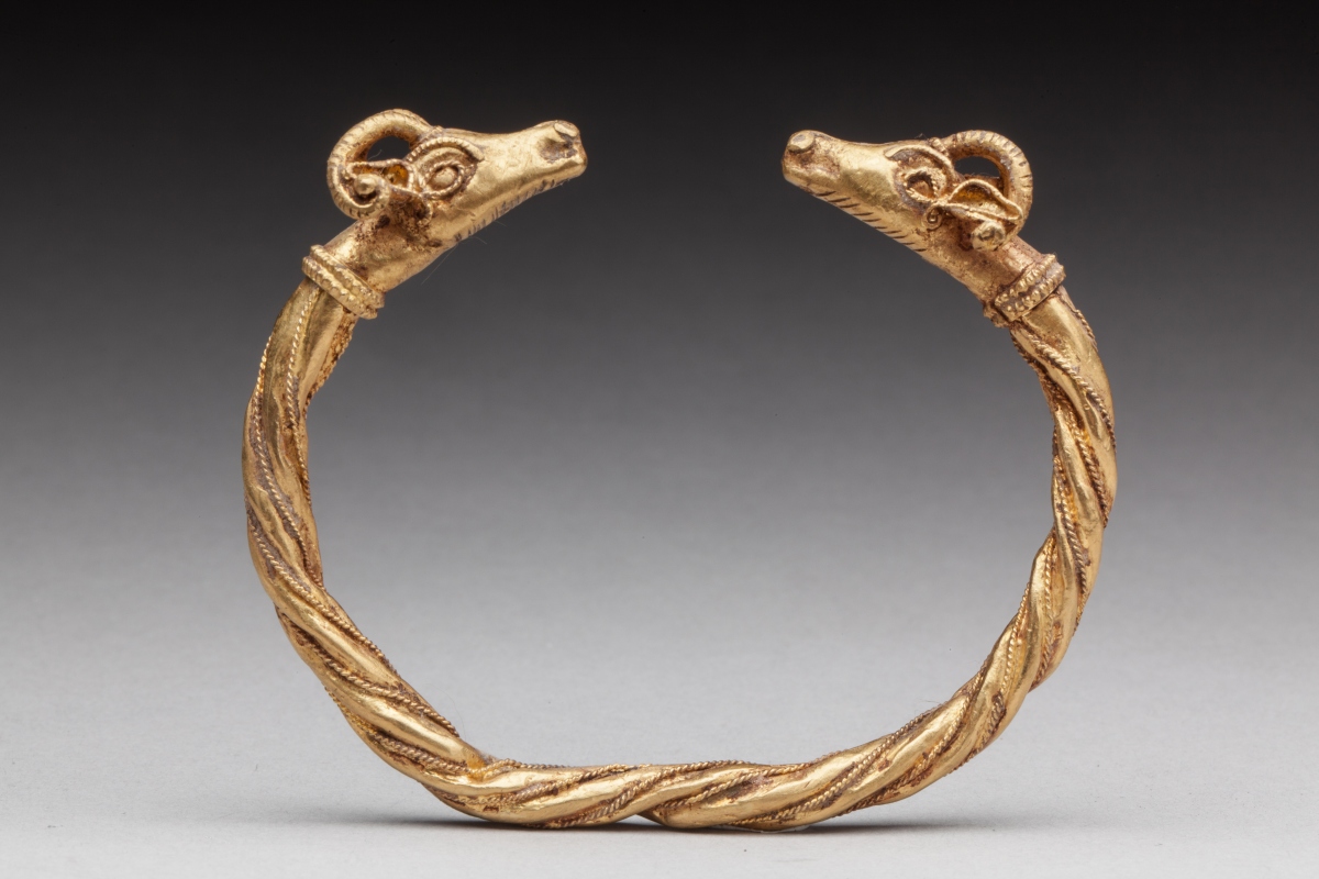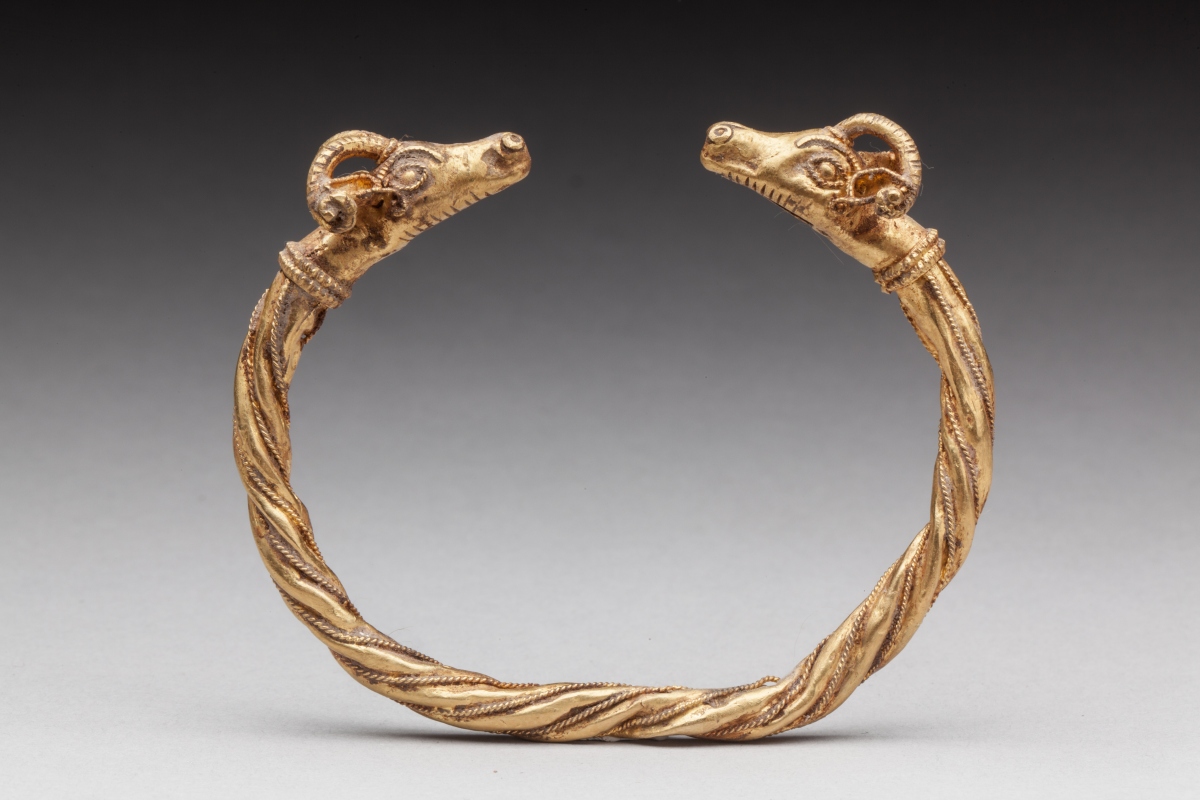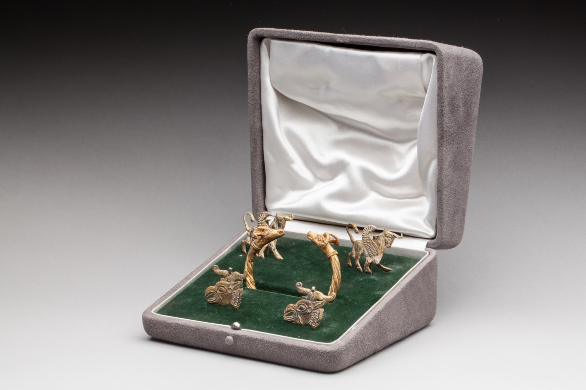 PARURE d'après l'Antique en or jaune comprenant : un BRACELET torque à têtes de bélier finement torsadé et filigranné, deux PENDENTIFS à tête de griffons et deux PLAQUES au taureau ailé.