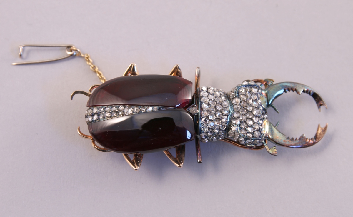 BROCHE SCARABÉE en or jaune 750 millièmes, le corps orné de diamants taillés en rose, les ailes en grenat.(Manque une pierre et traces d'oxydation).