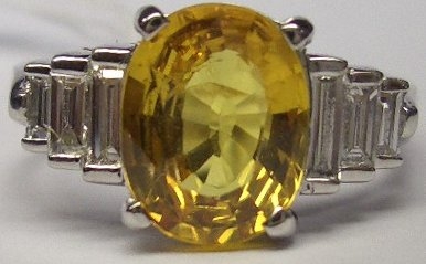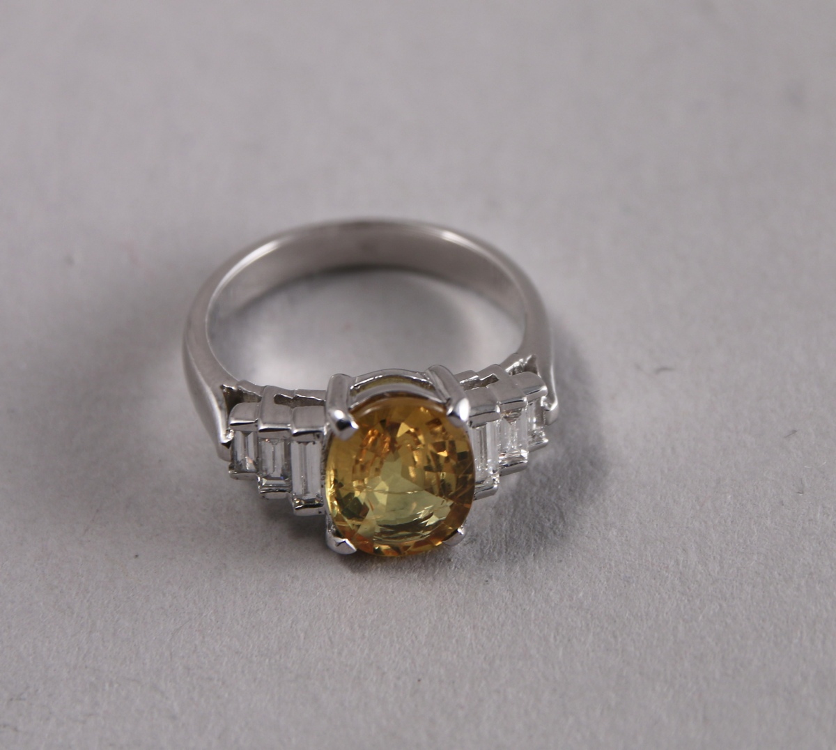 BAGUE en or blanc, ornée d'un SAPHIR jaune traité taille ovale d'envion 3 carats, épaulé de 6 DIAMANTS blancs taille baguette en chute d'environ 0,35 carat.