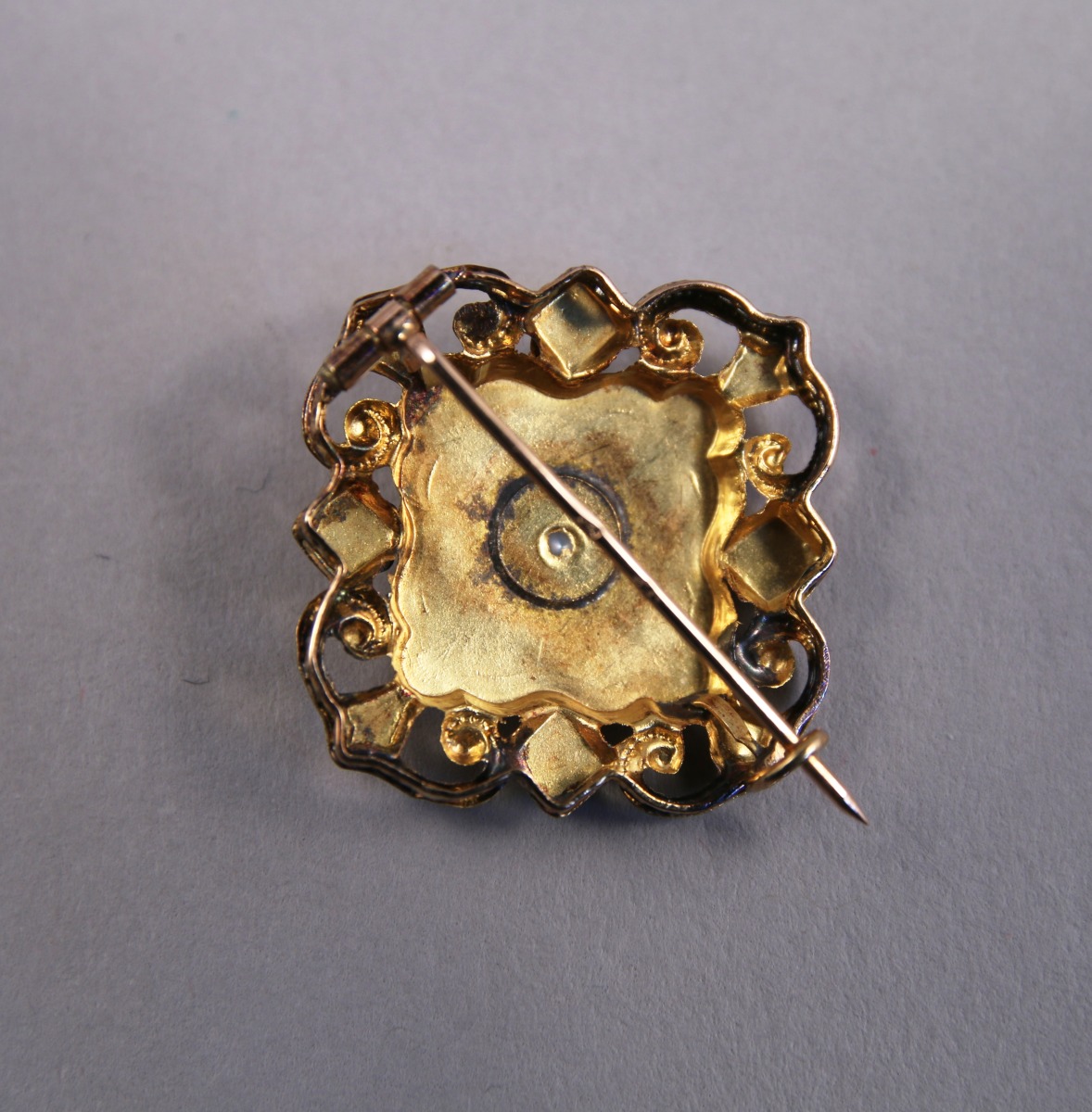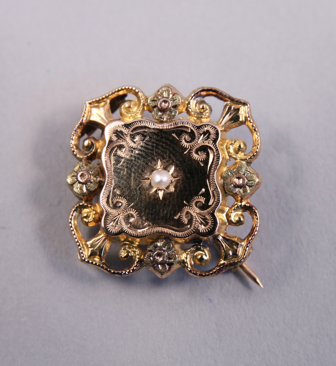 BROCHE en or jaune et rose, le plateau à décor d'une PERLE, de rinceaux stylisés et de fleurs.