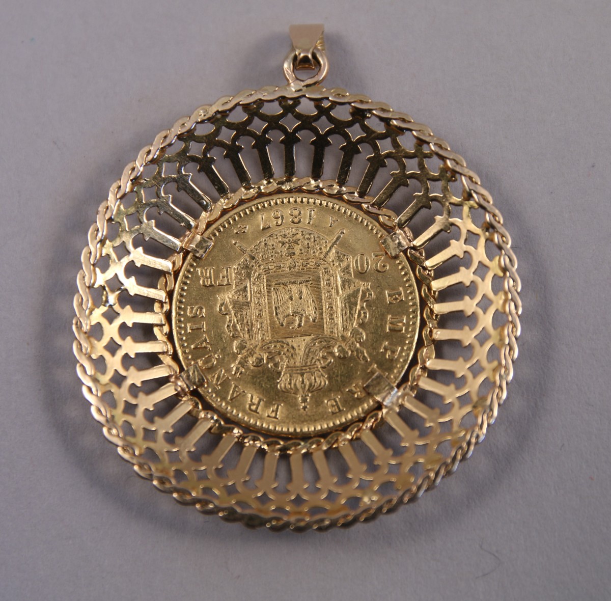 FRANCE. 20 Francs or, Napoléon III lauréé (1867) monté dans un PENDENTIF de forme circulaire ajouré.