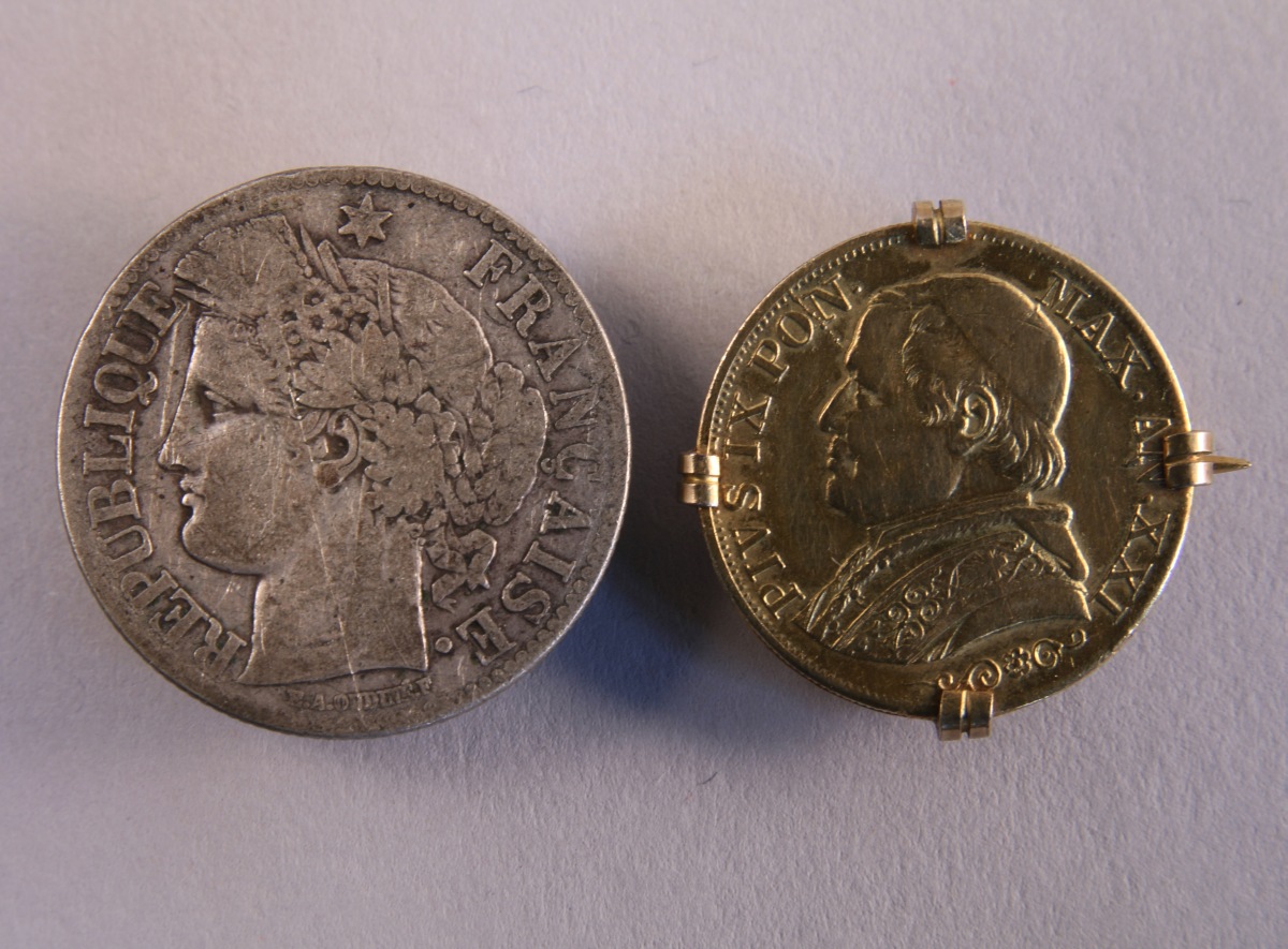 VATICAN. PIE IX (1846-1878), 1 Lire d'or (1866- an XXI) pièce montée en BROCHE.