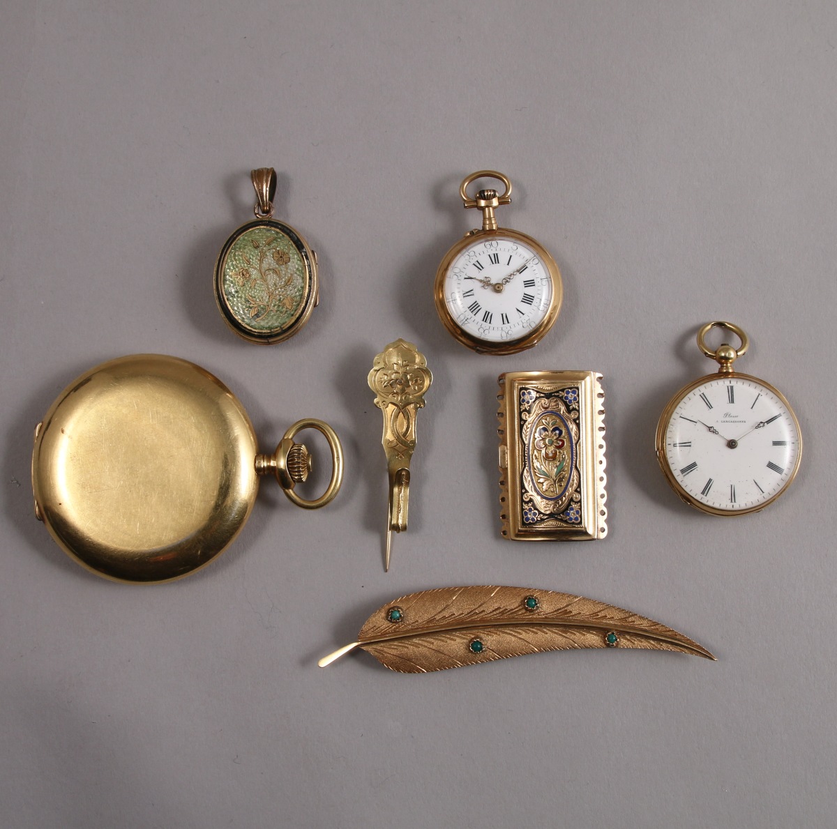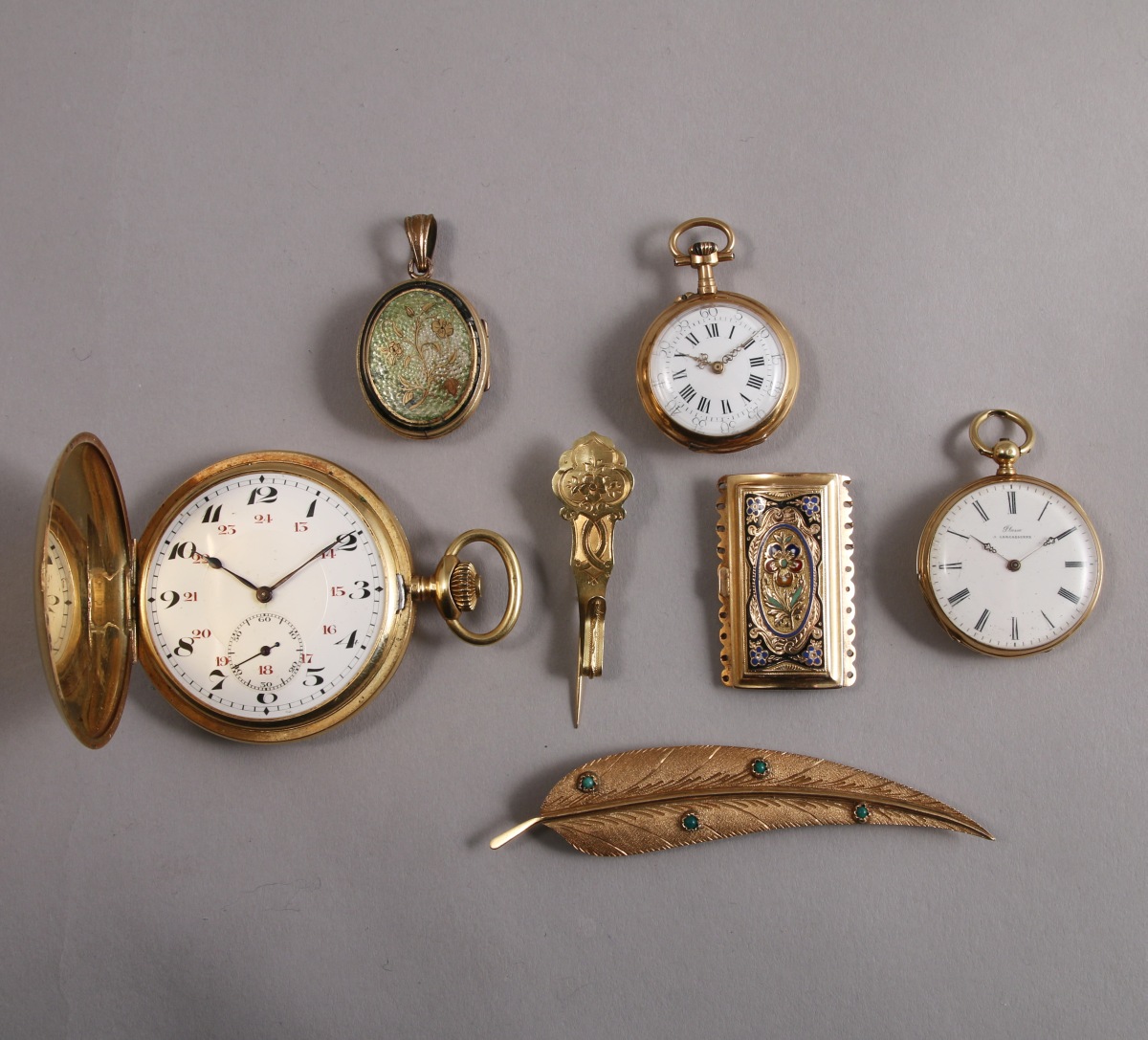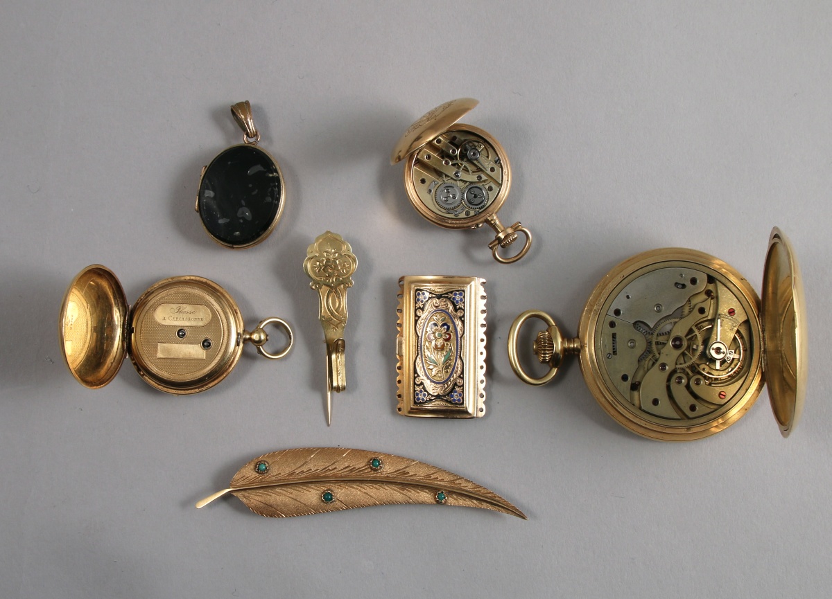 - DEUX MONTRES de COL à cadran émaillé blanc. L'une à dos bombé monogrammé "FR" (Diam. 2,8 cm.), l'autre à clef, le dos du boîtier ciselé de motifs feuillagés monogrammé "GL" dans un écu (Diam. 3,2 cm.). Poids brut total : 52,8 g.