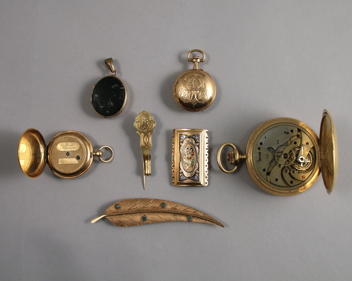 - TROIS BROCHES : l'une adopte la forme d'une plume sertie de quatre cabochons de pierre dure (poids brut : 7,5 g.); l'autre de forme rectangulaire est émaillée polychrome d'un cartouche fleuri (poids brut : 8,6 g.); la dernière munie d'un crochet est ciselée d'un motif floral (poids : 2,9 g.). Poids brut total : 19 g.