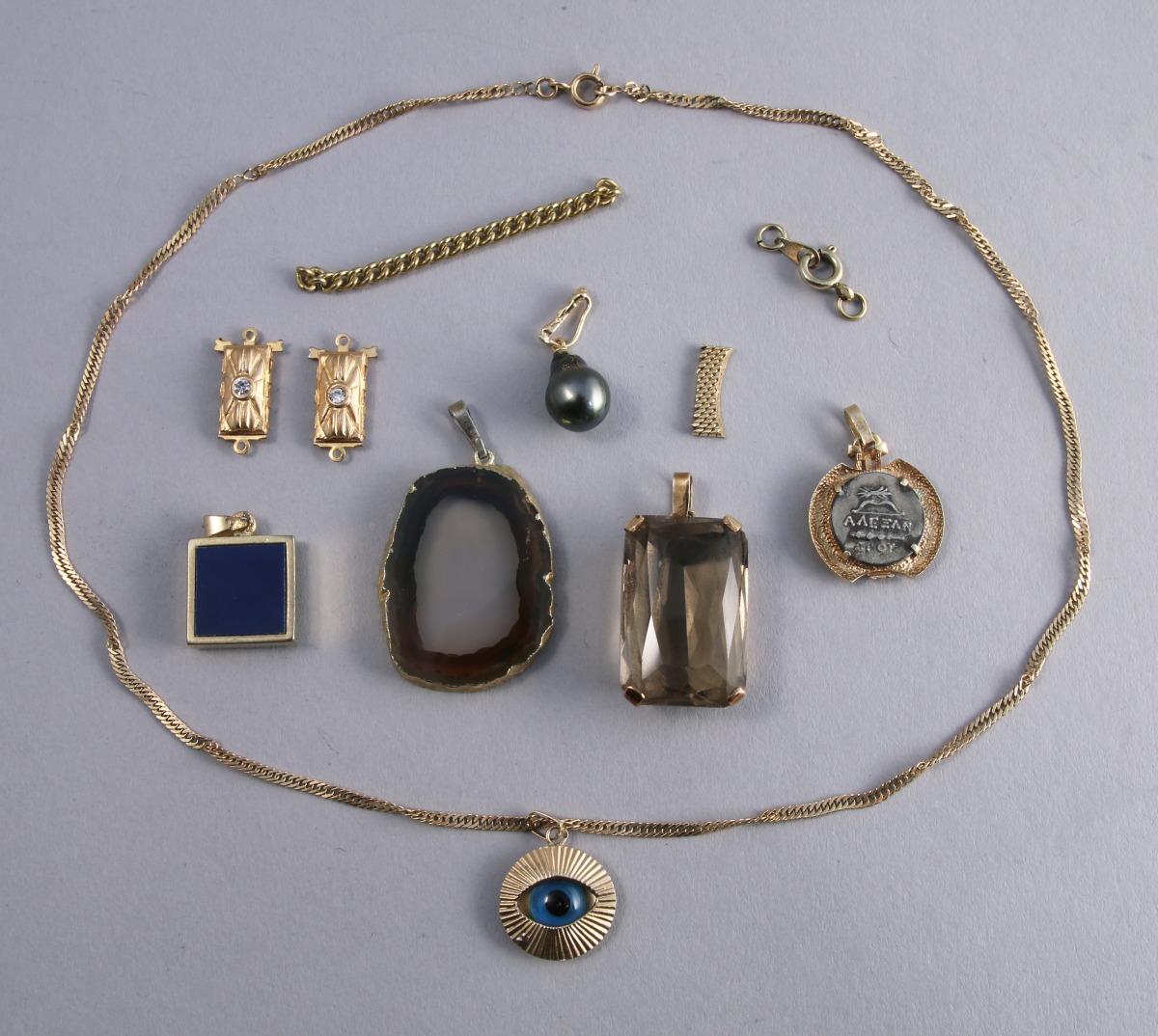 RÉUNION de PETITS BIJOUX en or jaune et métal doré orné de pierres, pièces et motifs décoratifs, tels que : pendentifs, boucles d'oreilles, chaîne, et éléments brisés.