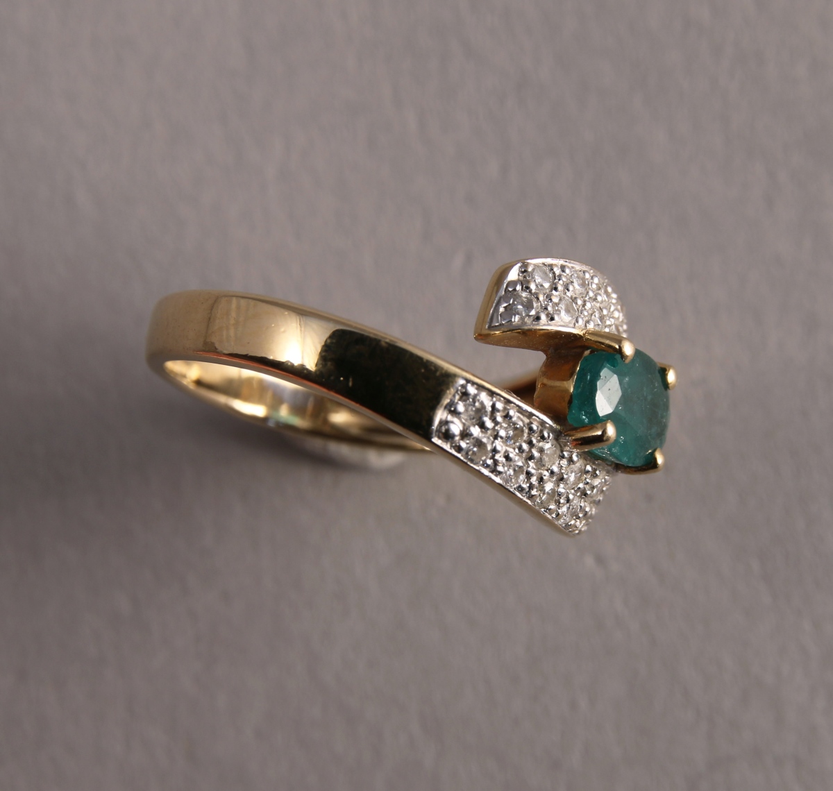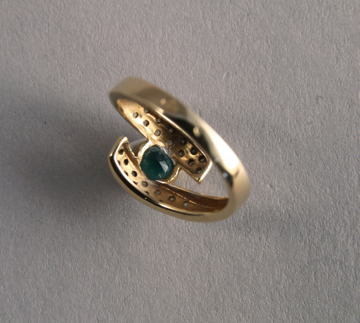 BAGUE sertie d'une ÉMERAUDE taille ovale flanquée de deux pavages de brillants.