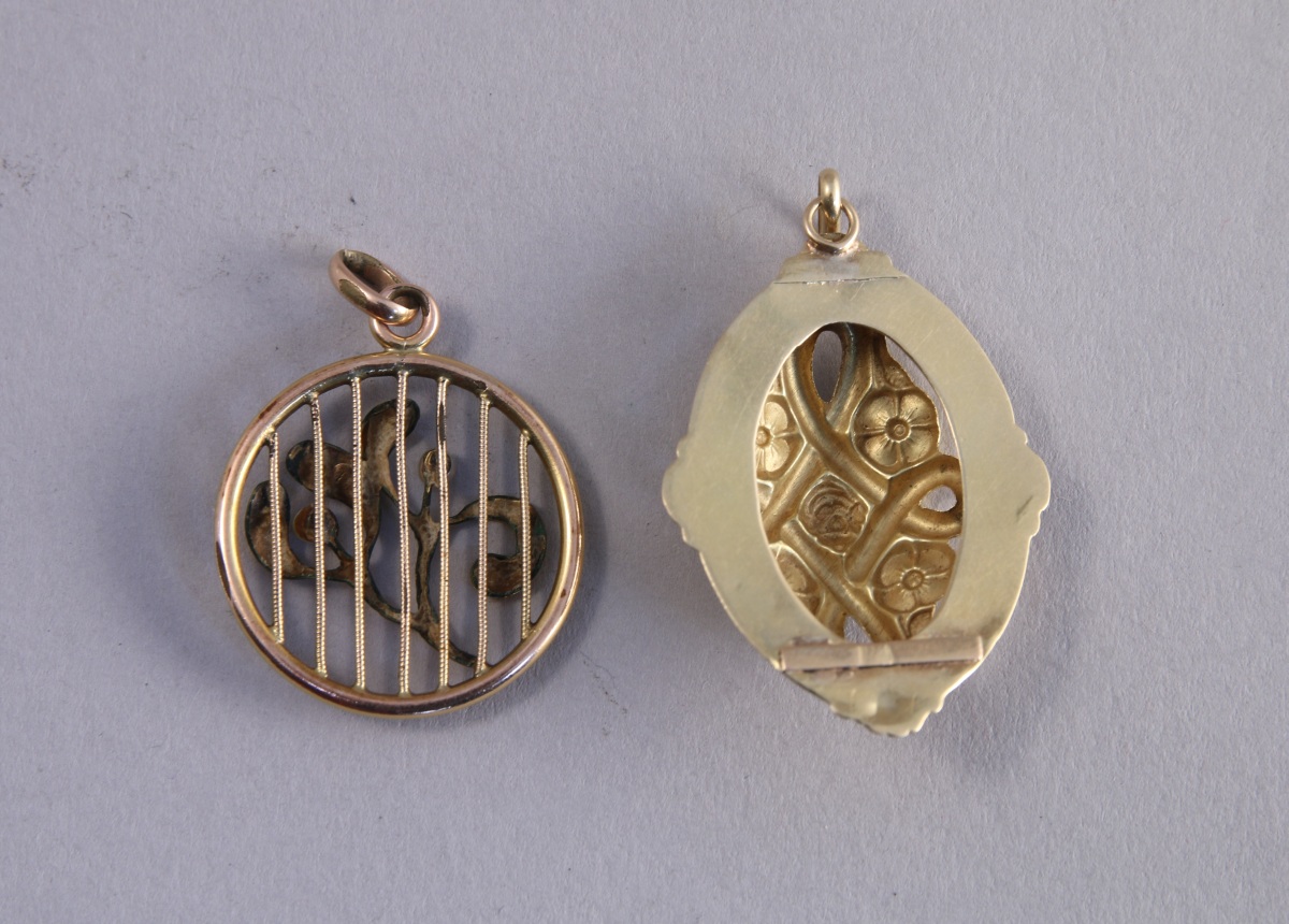 2 PENDENTIFS en or jaune ajouré. L'un de style ART NOUVEAU de forme circulaire avec un brin de muguet orné de deux perles (Diam. 22 mm), l'autre de forme ovale et bombé avec de petites fleurs (Haut. 35 mm).