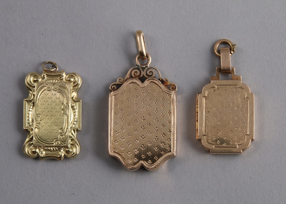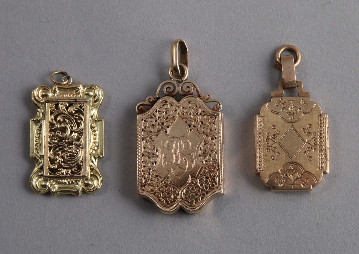 3 MÉDAILLONS porte-photos en or rose et jaune gravé et ajouré, l'un avec un verre.