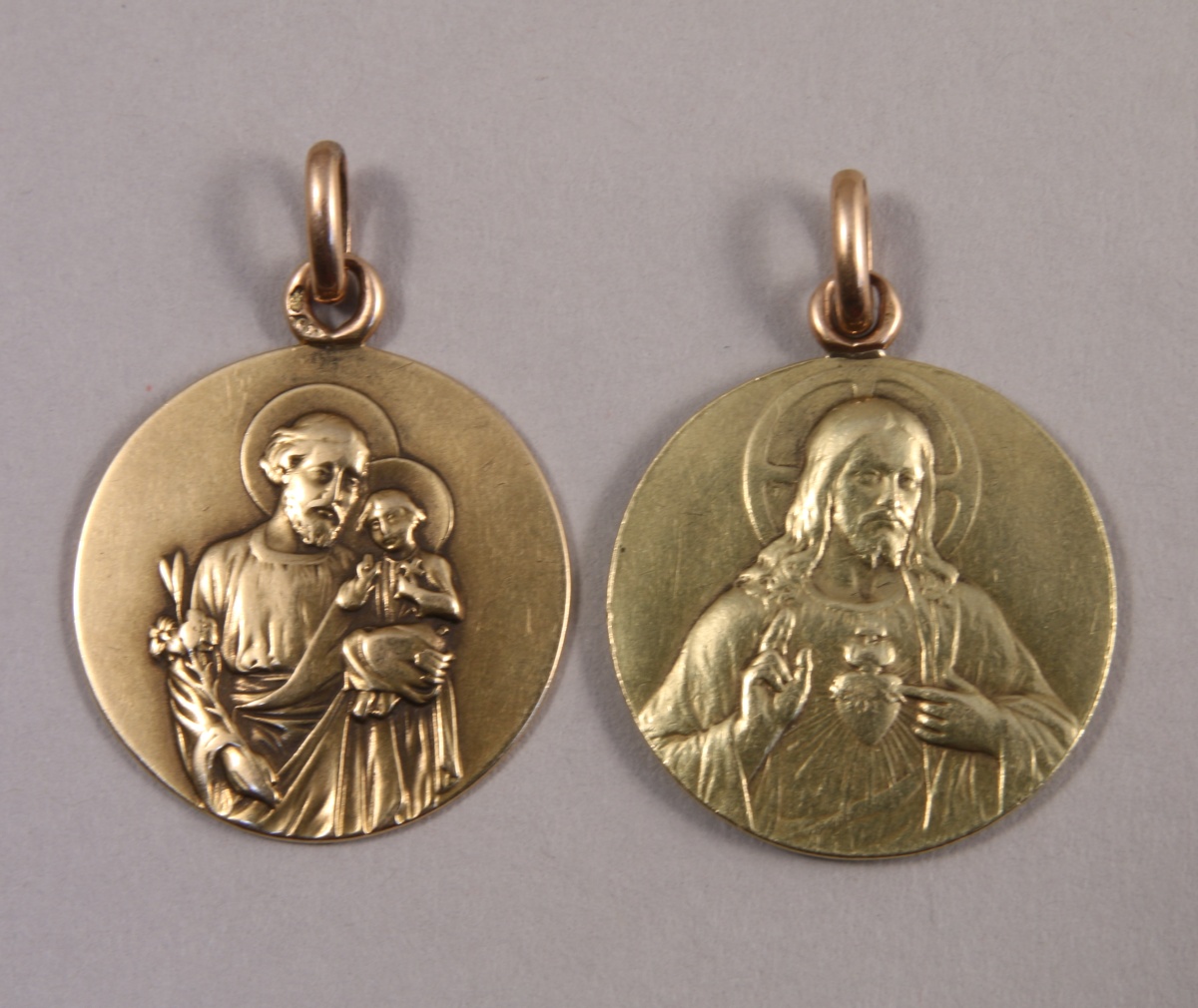 2 MÉDAILLES de baptême en or jaune. L'une à Saint-Joseph, l'autre au Sacré-Coeur de Jésus et au revers la Vierge de majesté à lenfant l'inscription "Virgo carmeli ora pro me".