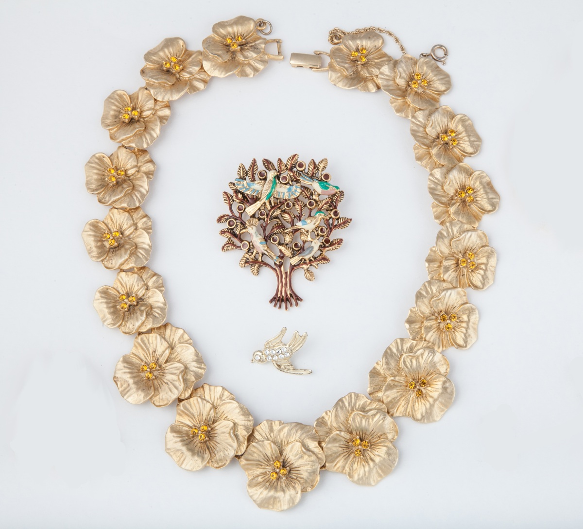 JOINT : BROCHE en métal doré émaillé polychrome figurant un arbre animé d'oiseaux et un OISEAU.