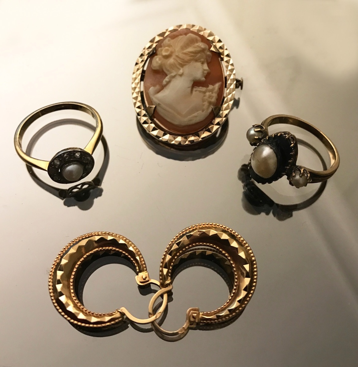 2 BAGUES en or jaune ornée de PERLES, l'une dans un entourage de BRILLANTS (3,3 et 2,7 g), et une paire de PENDANTS d'OREILLES en or jaune (1,8 g).