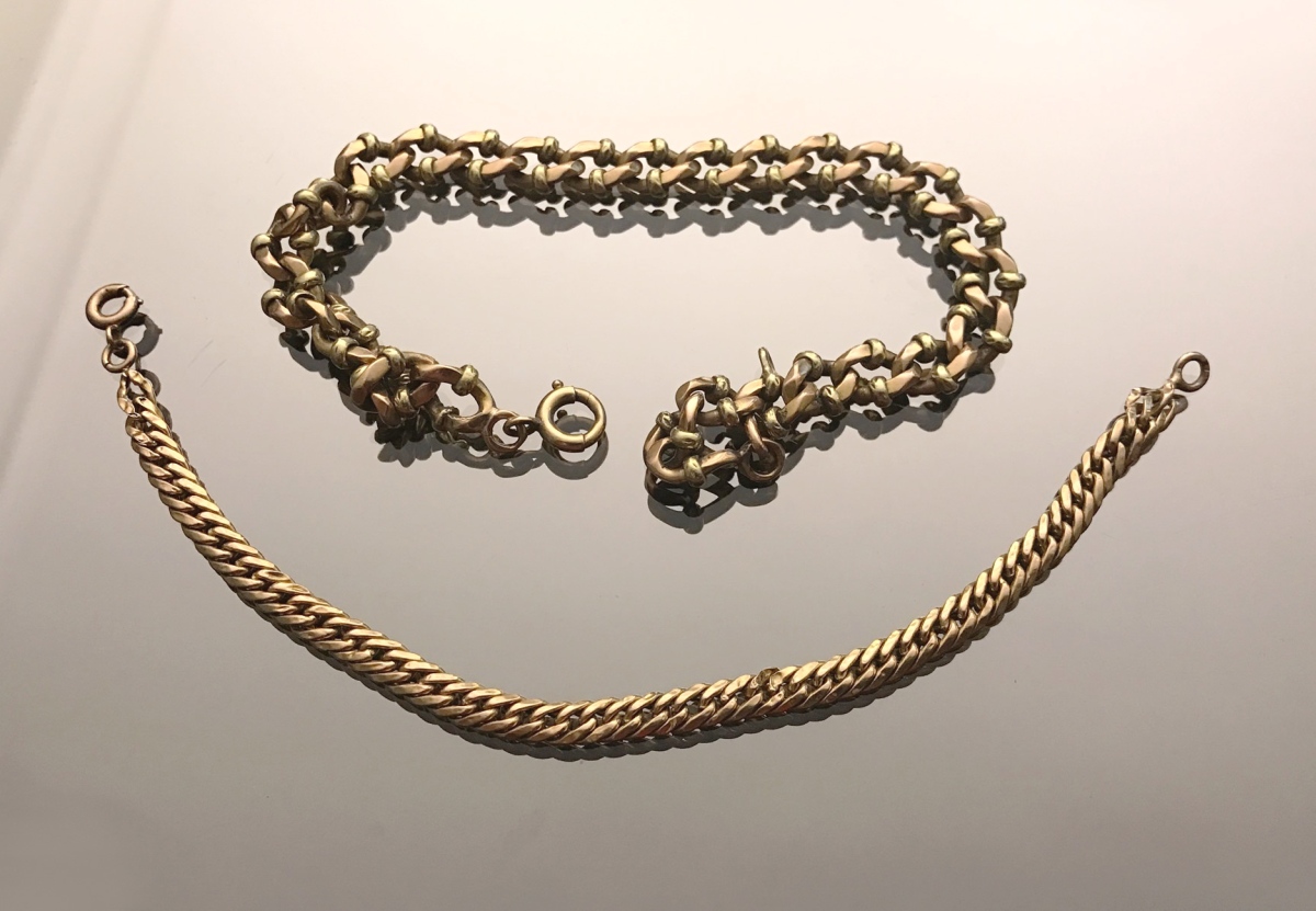 GOURMETTE en or rose et jaune, ancienne chaine de montre giletière (long. 20 cm) et GOURMETTE en or jaune à maille plate (long. 14 cm).