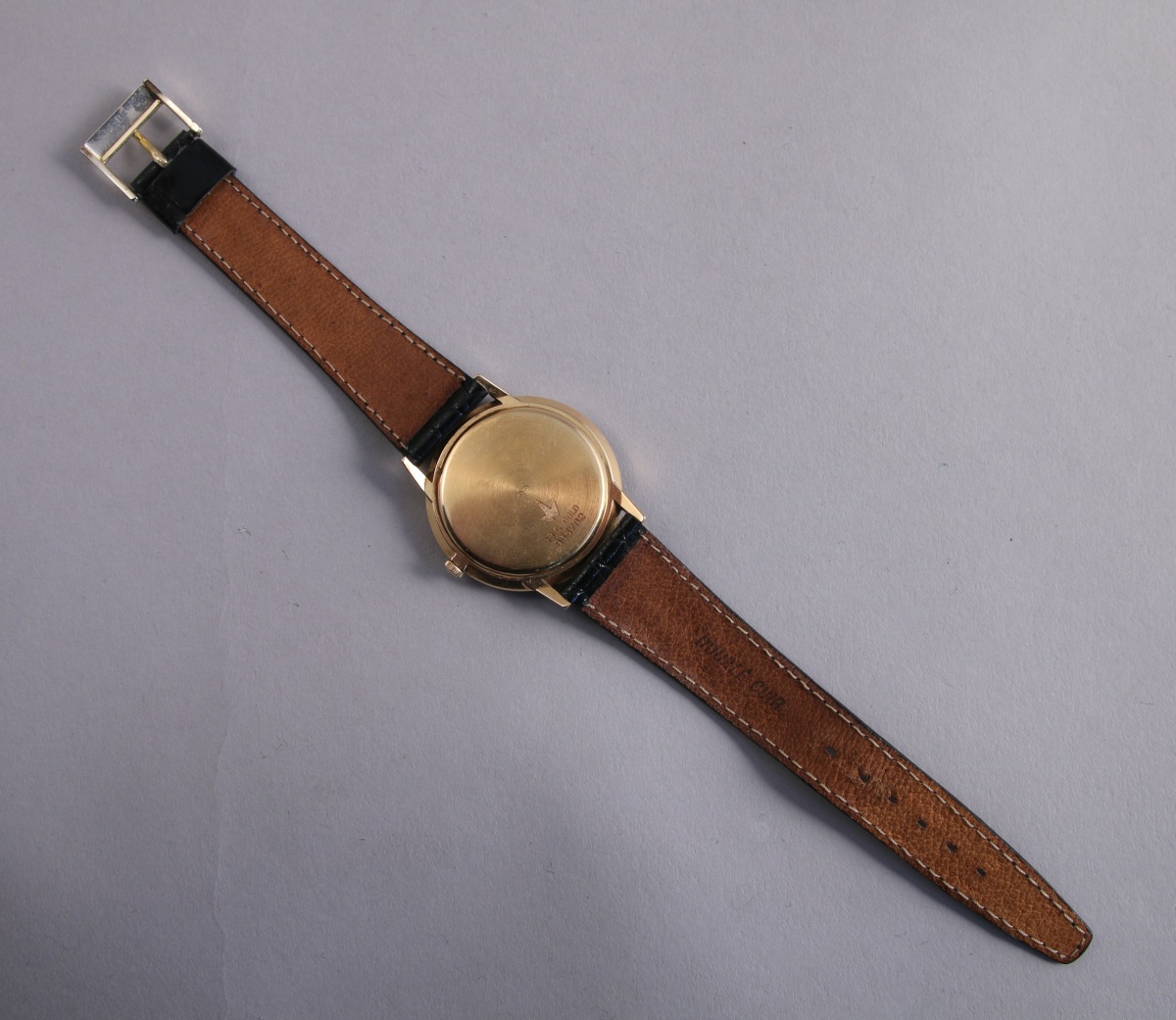 BUREN. MONTRE-BRACELET d'homme en or jaune. Modèle "intra-matic". Mécanisme à remontage manuel (accdt). Cadran métallique à index bâtonnets et guichet dateur. Boîtier numéroté 935702. Bracelet de cuir noir rapporté.