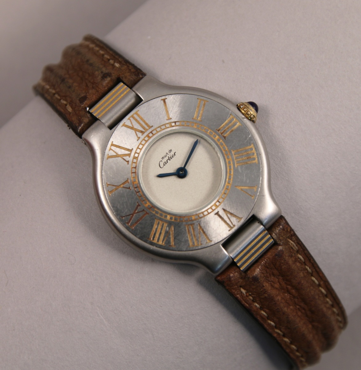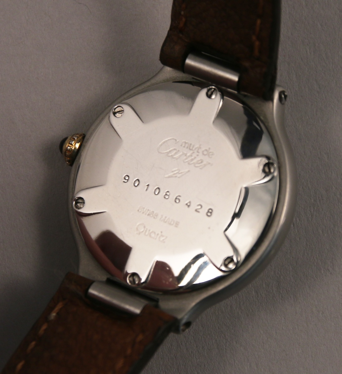 CARTIER. MONTRE-BRACELET de dame "Must 21" de forme ronde en acier brossé et doré. Large lunette à chemin de fer indiquant les heures en chiffres romains. Cadran à fond blanc signé, aiguilles en acier bleuï. Remontoir à cabochon bleu. Fond à six vis signé et numéroté. Mouvement à quartz. Bracelet en cuir à boucle déployante (piqûres).