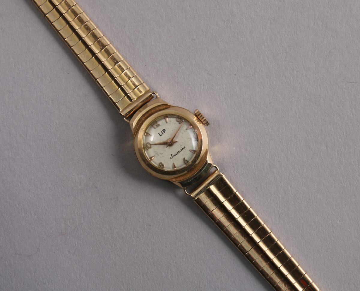 LIP. MONTRE-BRACELET de dame en or jaune 750 millièmes, modèle "Souveraine". Mécanisme à remontage manuel. Le cadran indique les heures en chiffres arabes et index bâtonnets.