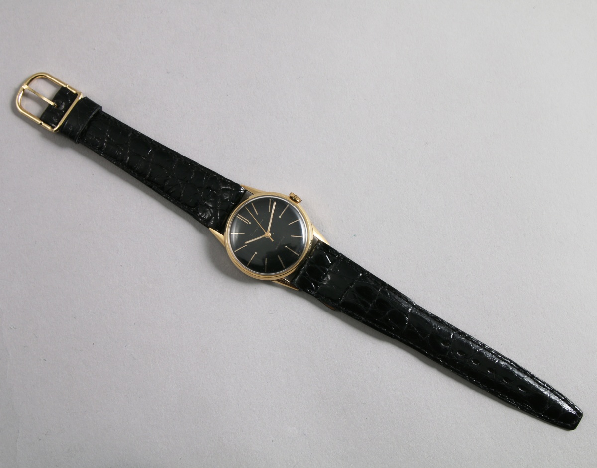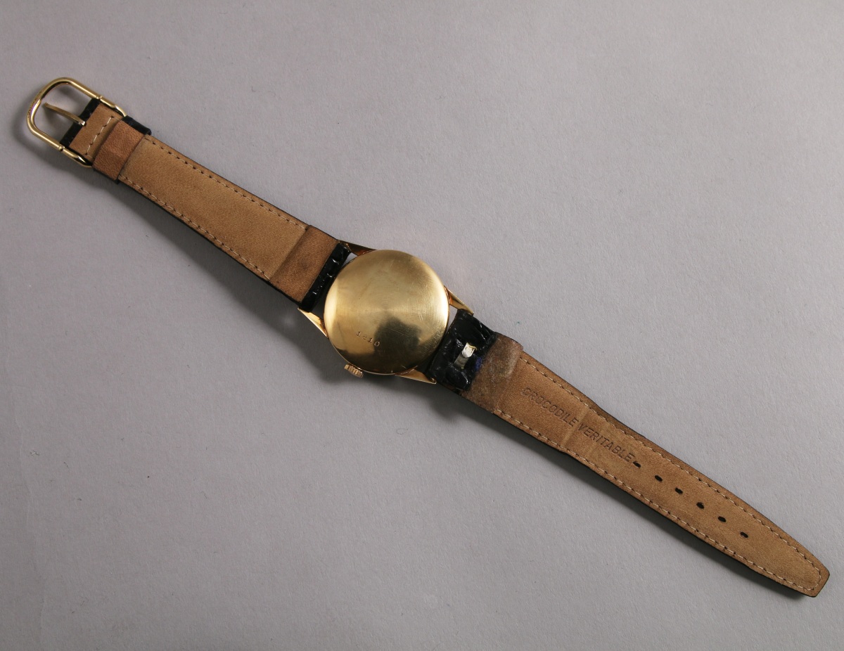 LIP-DAUPHINE (antichoc). MONTRE BRACELET de dame en or. Le cadran noir, le boitier de forme ronde, légèrement bombé, numéroté "1810". Mouvement mécanique. Le bracelet en cuir noir.