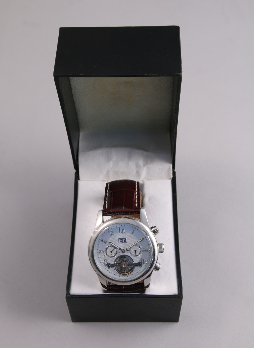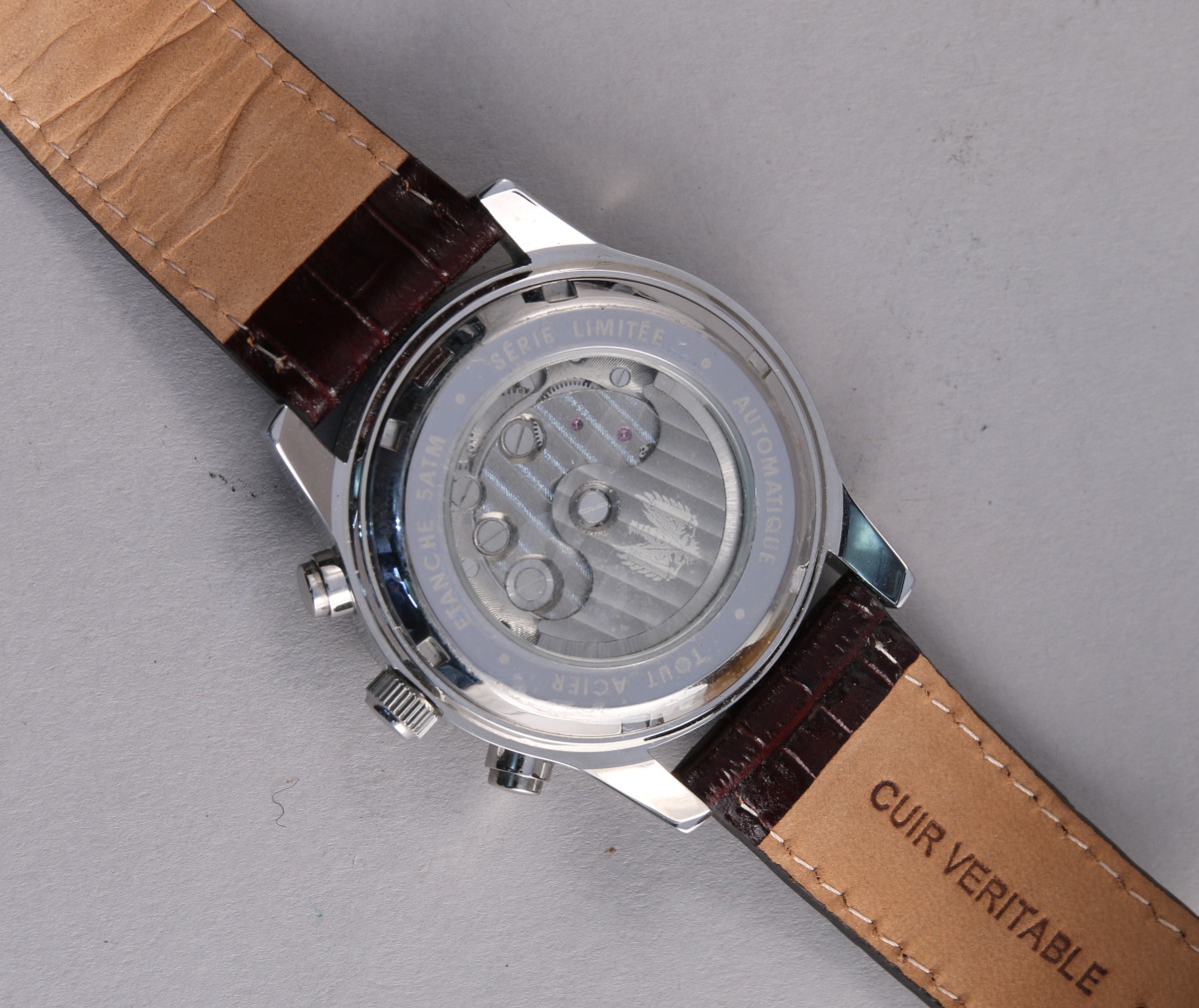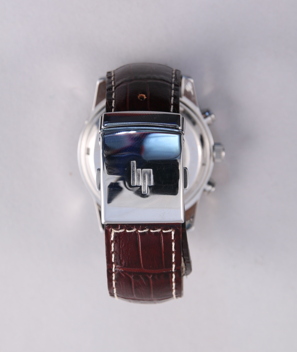 LIP. MONTRE BRACELET K2L27 à mouvement automatique, guichet dateur à 12 heures, deux petits cadrans pour les jours de la semaine et pour les mois, le grand gradué pour les minutes, les heures en chiffres romains. Boitier en acier étanche et bracelet de cuir. État Neuf.